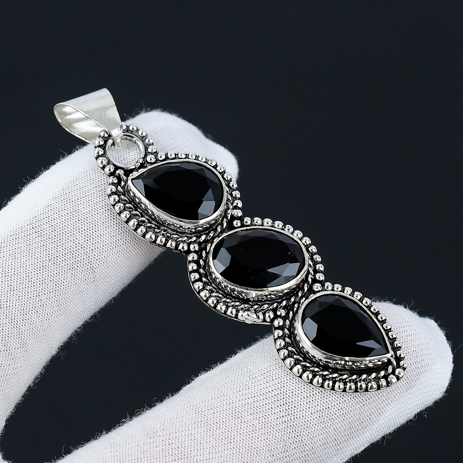This stunning piece features three beautifully faceted black gemstones set in intricate silver detailing, offering a perfect balance of elegance and sophistication. The rich, dark hue of the stones adds a touch of mystery and allure, making it a versatile accessory for any occasion.