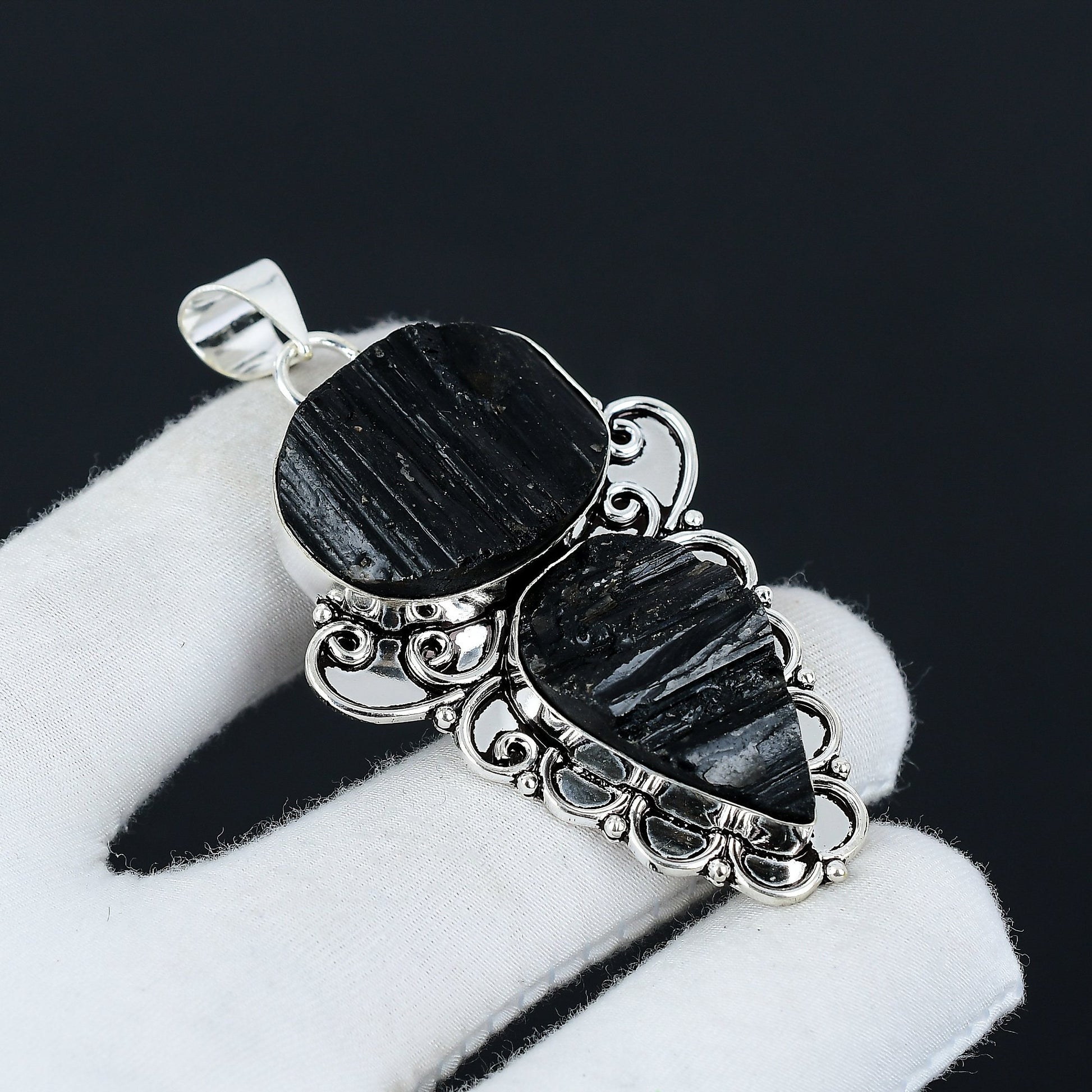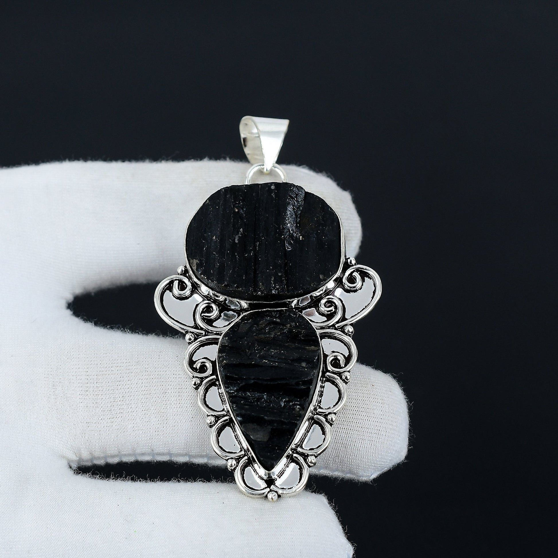 Featuring a unique and captivating design, this pendant highlights the natural beauty of raw black stones, complemented by intricate silver detailing.