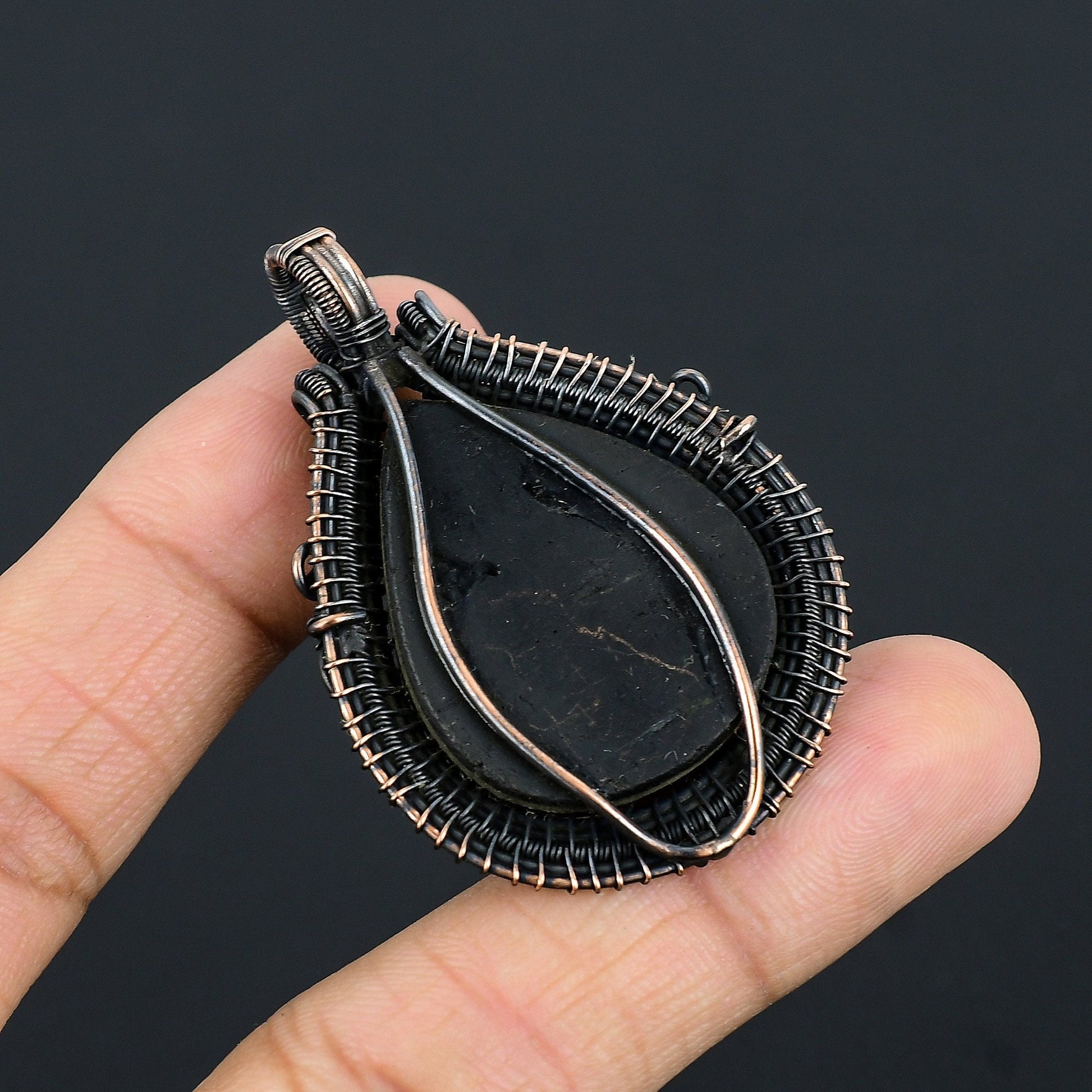 This stunning piece features a deep black stone, wrapped in intricate wire work, offering a unique blend of elegance and craftsmanship.