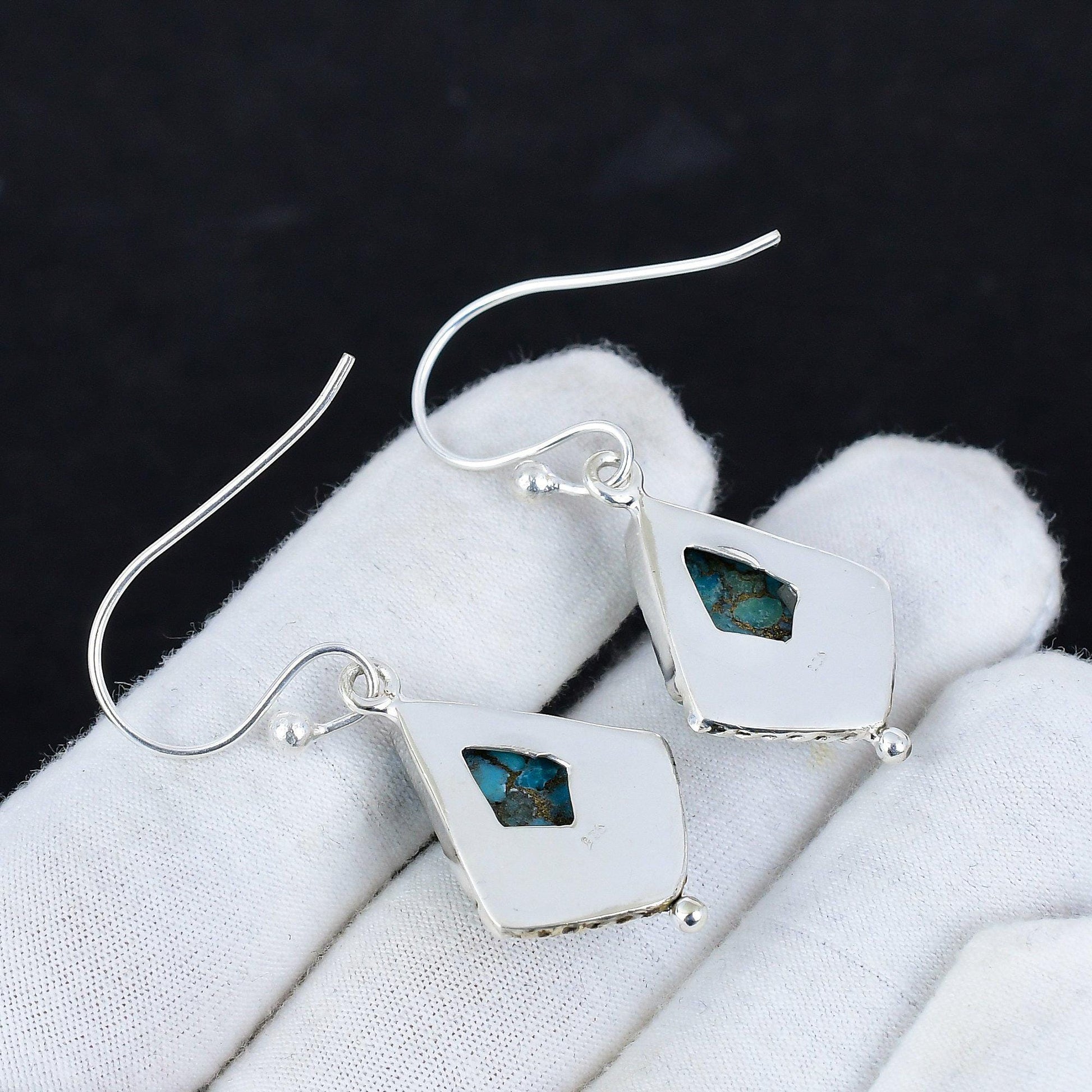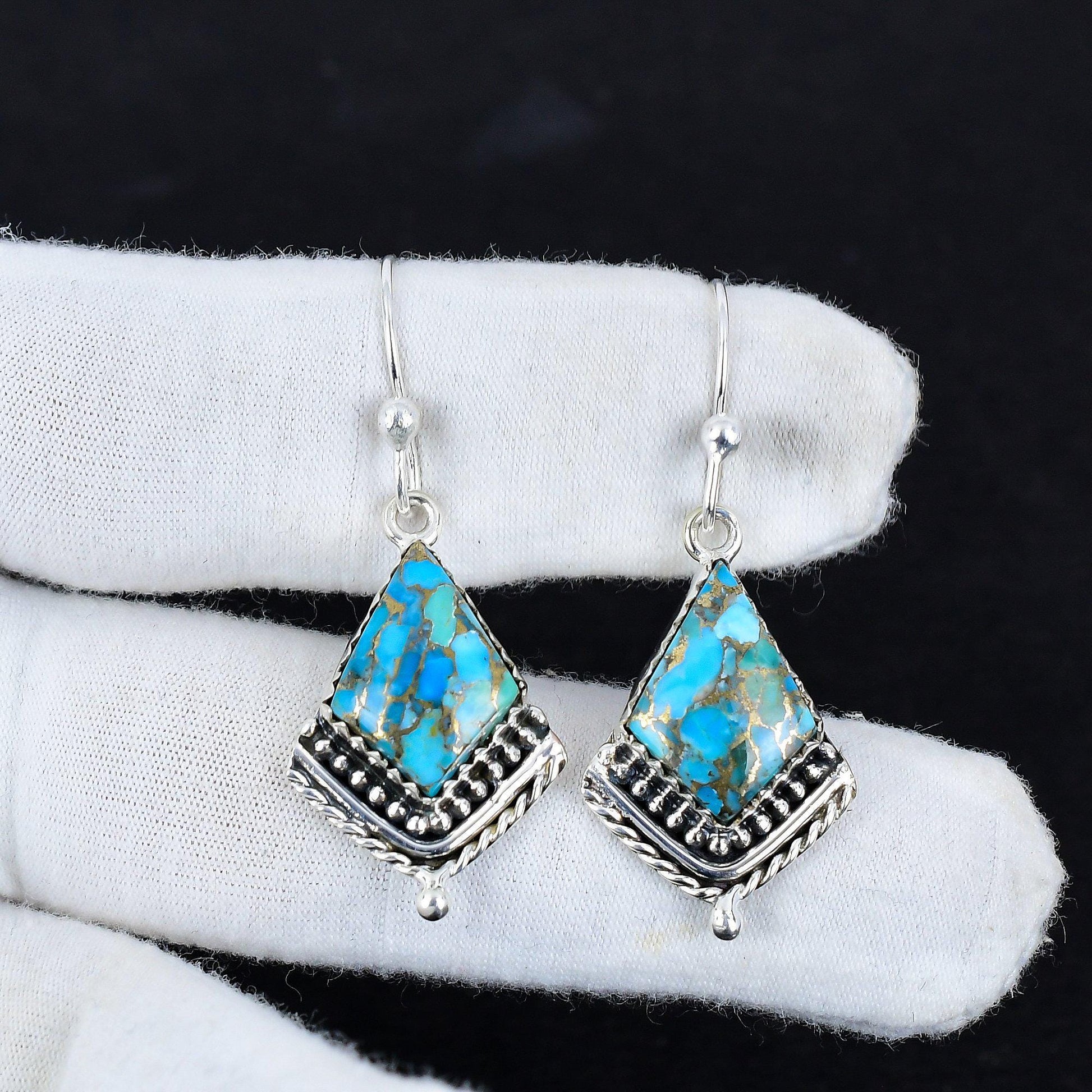 Experience the allure of timeless elegance with these exquisite turquoise dangle earrings. Expertly crafted, these earrings feature beautiful turquoise stones set in a striking diamond-shaped design.