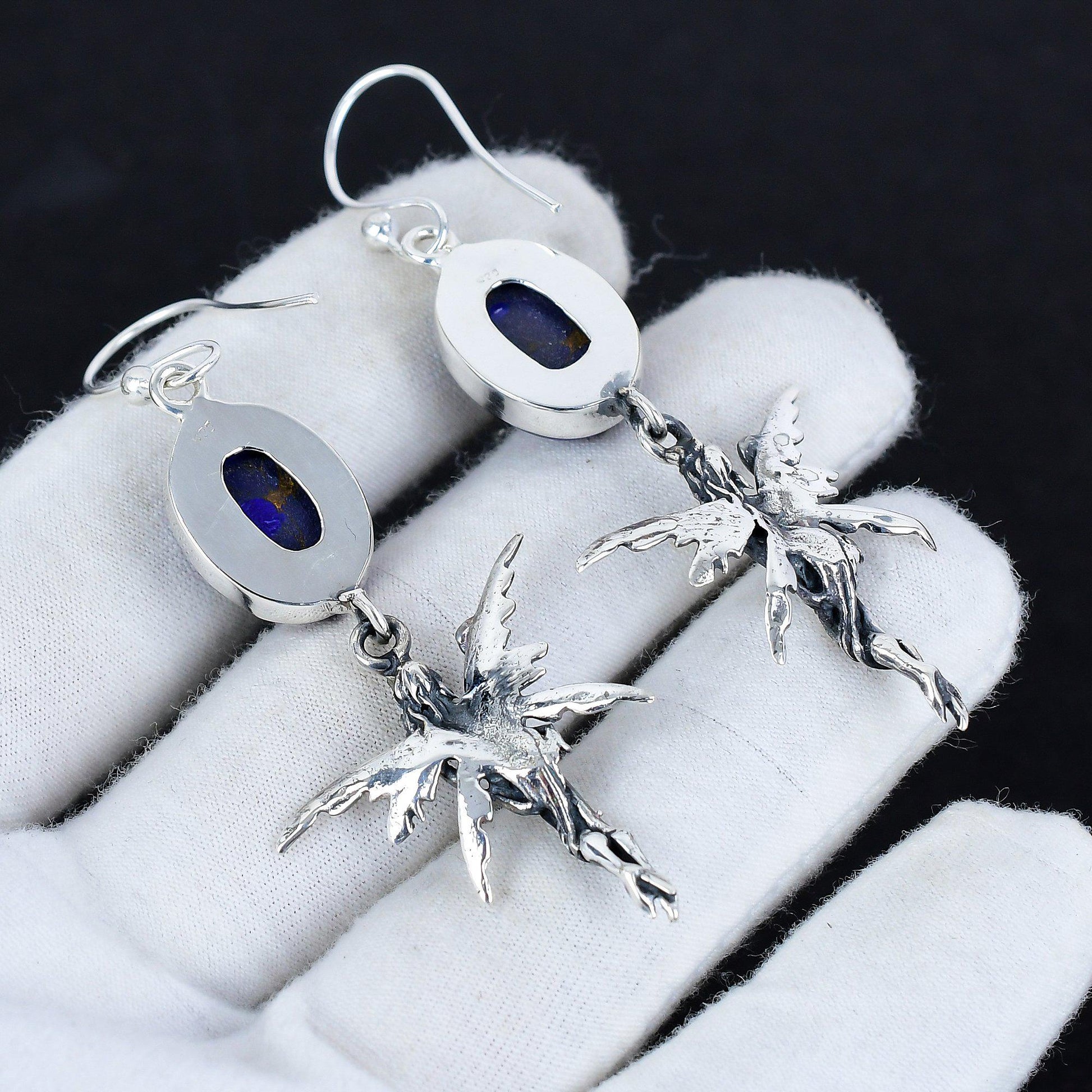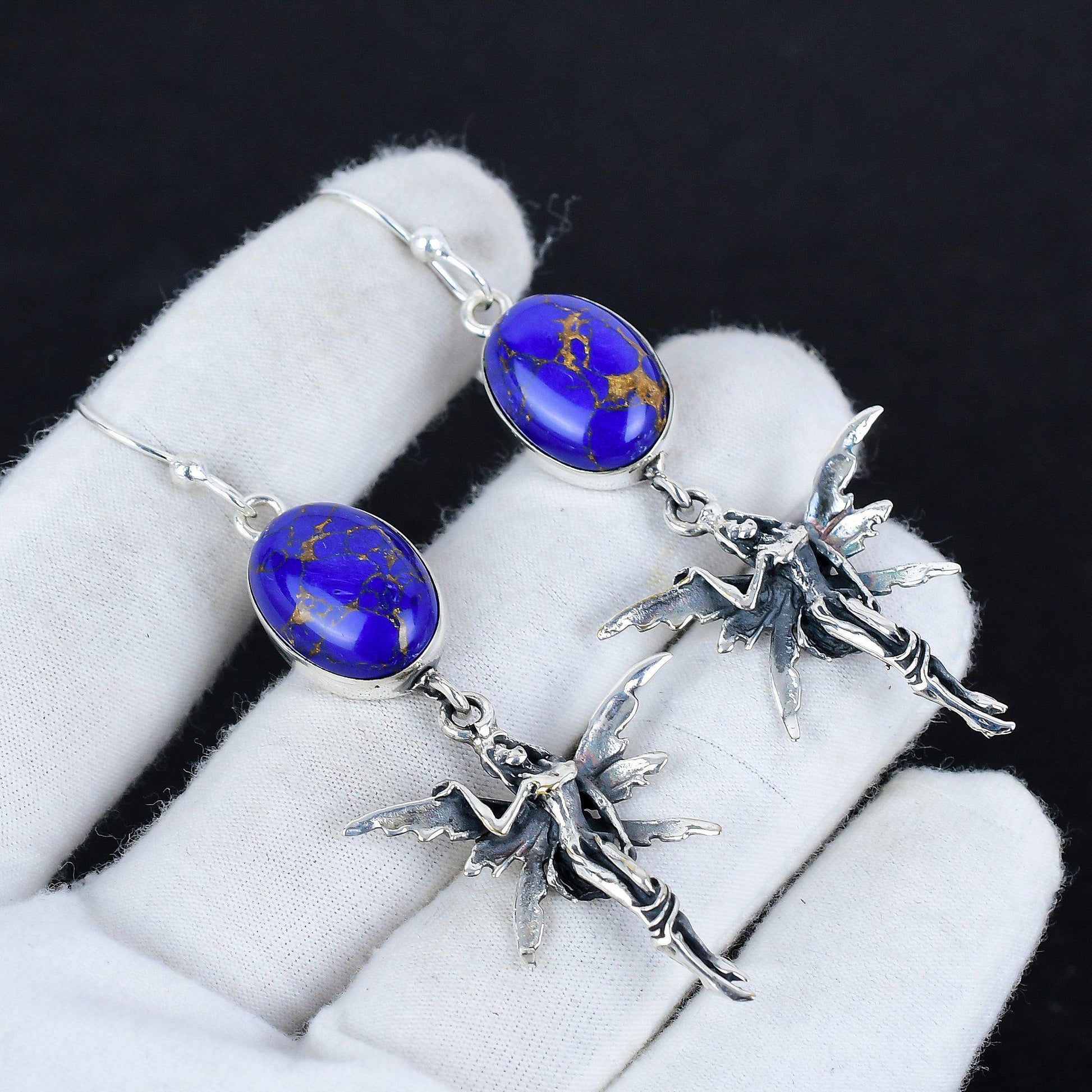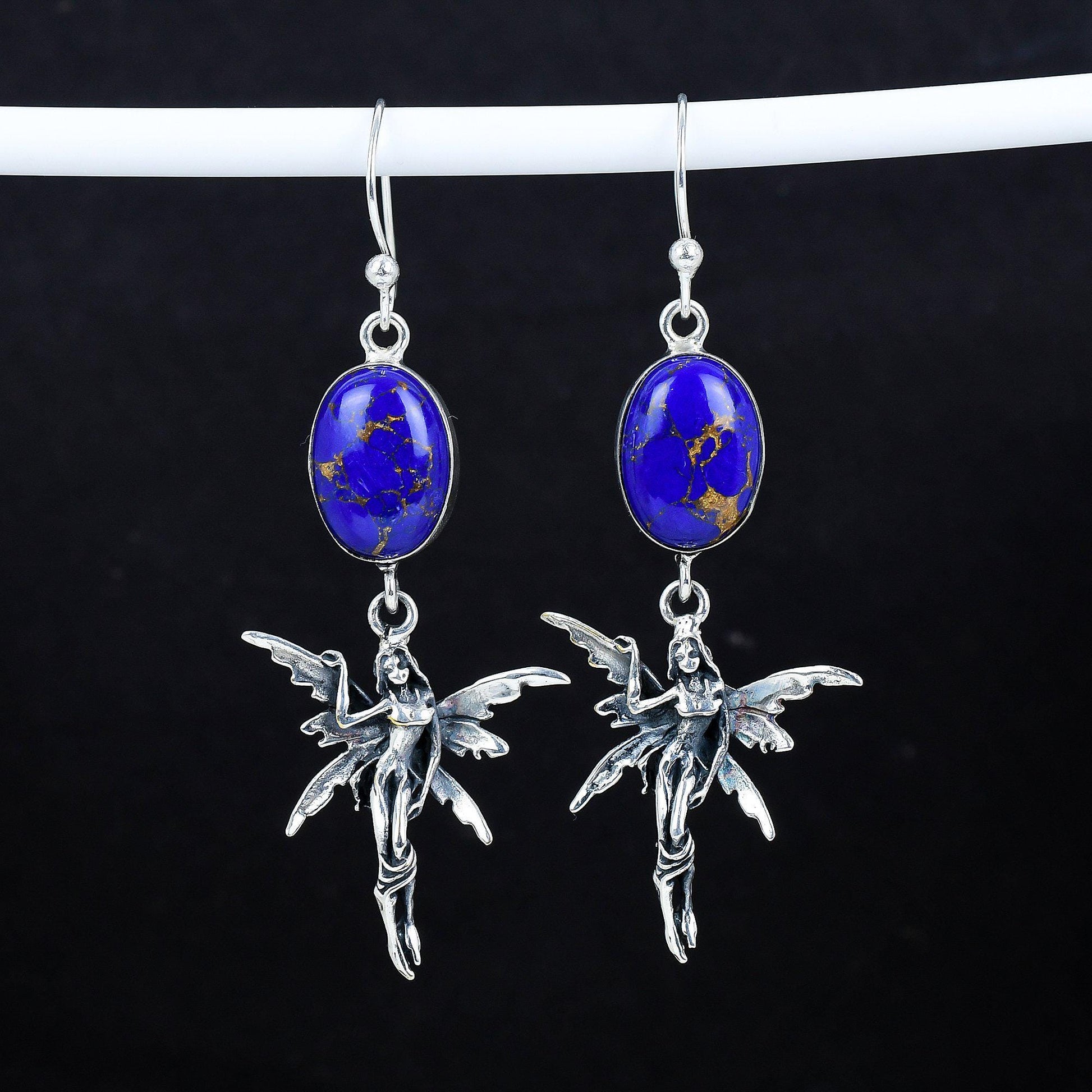 Elevate your style with these enchanting fairy earrings, featuring vivid blue stones accented with delicate golden veins. Each earring showcases a beautifully crafted fairy, adding a touch of whimsy and elegance to your look.