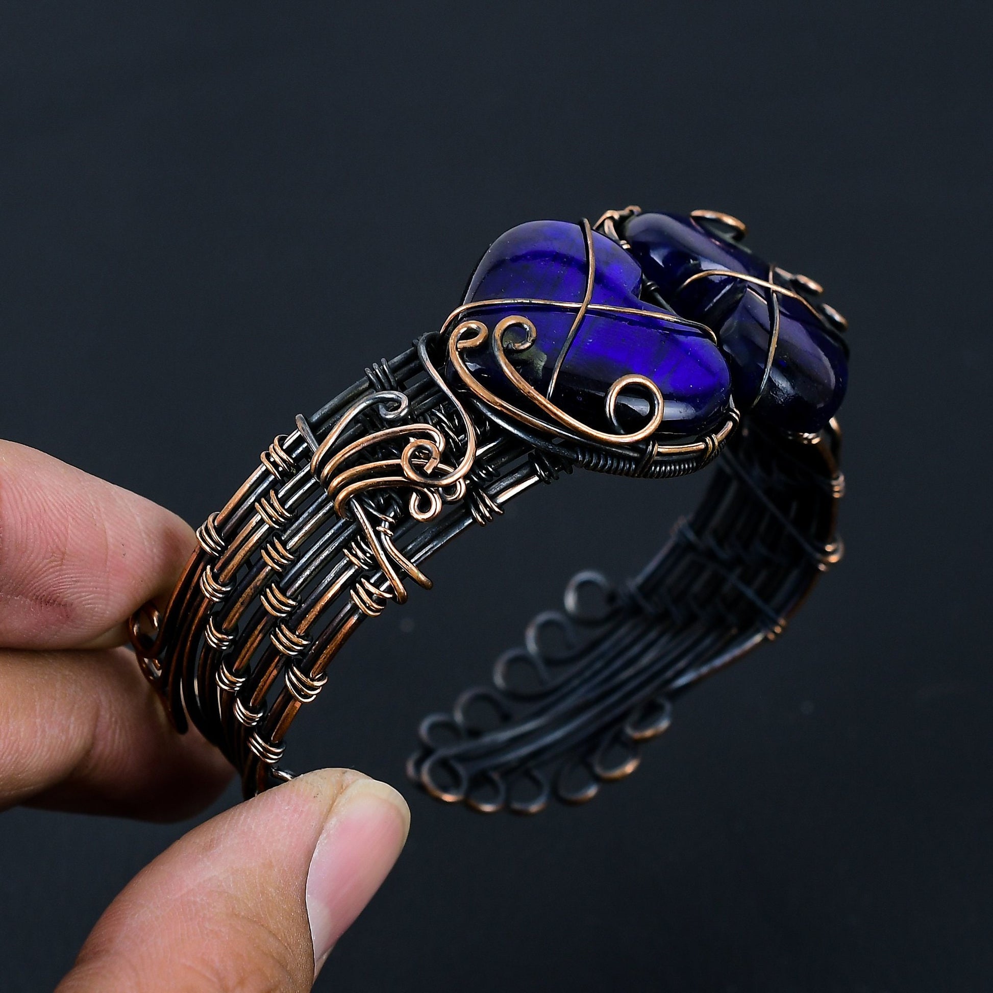 Experience the allure of timeless elegance with our handcrafted Heart-Shaped Wire Bracelet. Each piece is meticulously designed, showcasing dual deep blue heart stones wrapped in intricate copper wirework, offering a harmonious blend of boldness and delicacy.