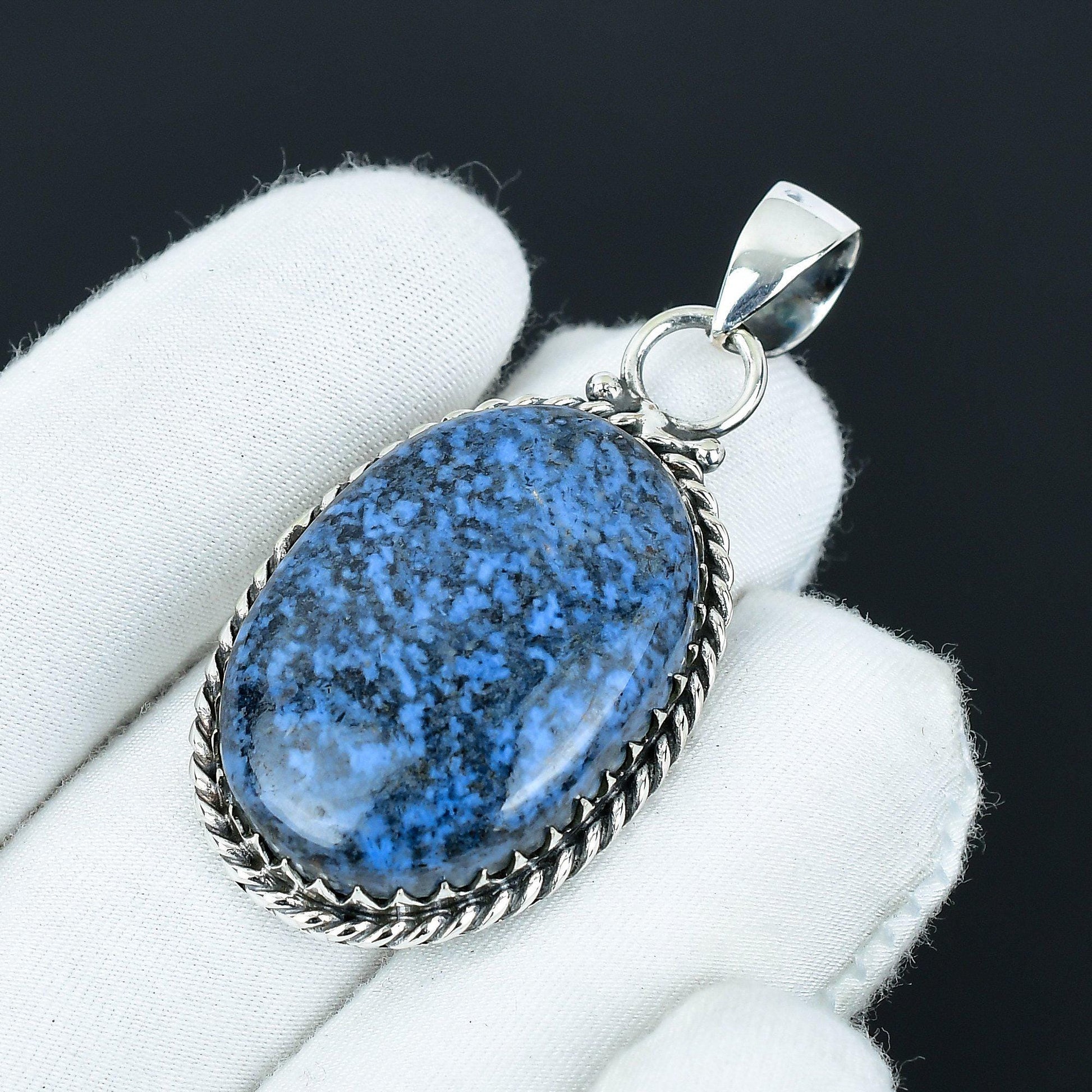 Design: This piece features a stunning blue stone with unique black and white speckles, set in an intricately detailed, twisted silver frame.