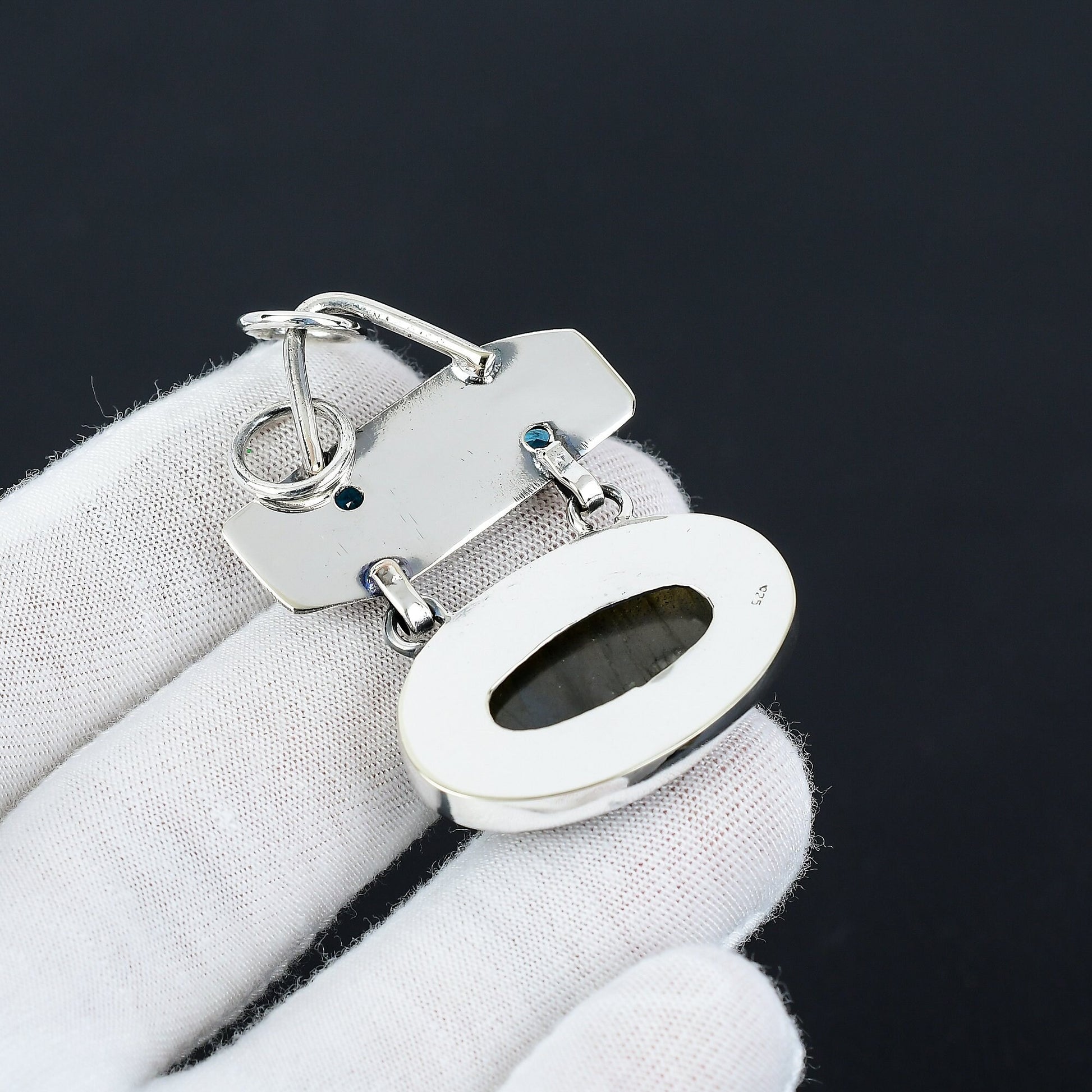 Design: This stunning piece features a vibrant labradorite stone, elegantly complemented by shimmering blue accents. The intricate textured detailing adds a touch of sophistication.
