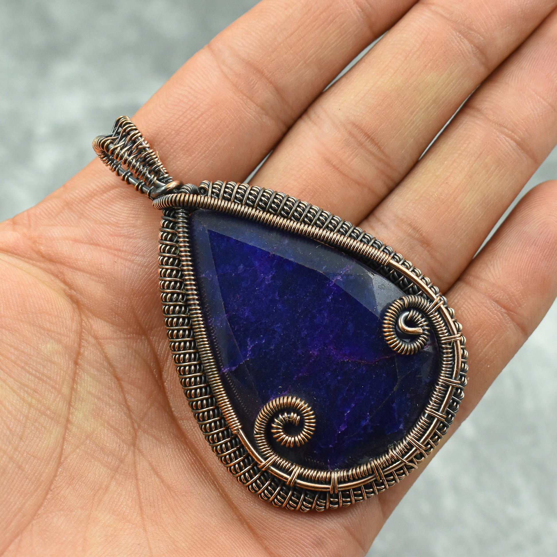 Discover the allure of our exquisite handcrafted pendant, featuring a stunning deep blue gemstone encased in intricate copper wirework.