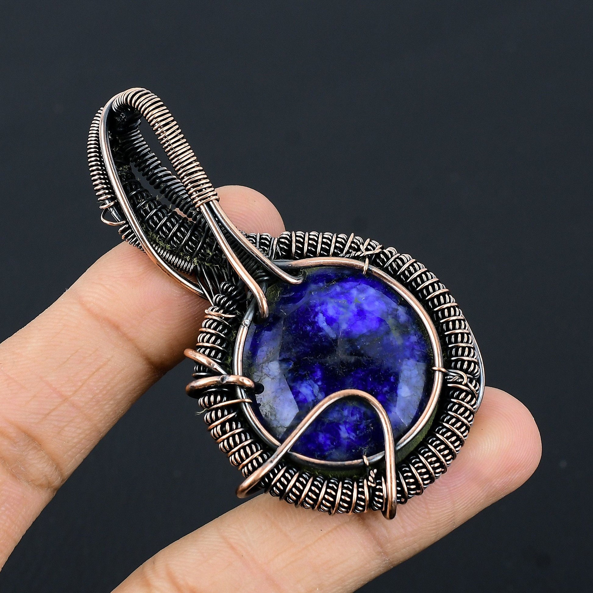 This stunning pendant features a mesmerizing deep blue gemstone, intricately encased in delicately woven metal wire. The craftsmanship highlights the natural beauty and vibrant color of the stone, drawing every eye to its captivating, intricate design.