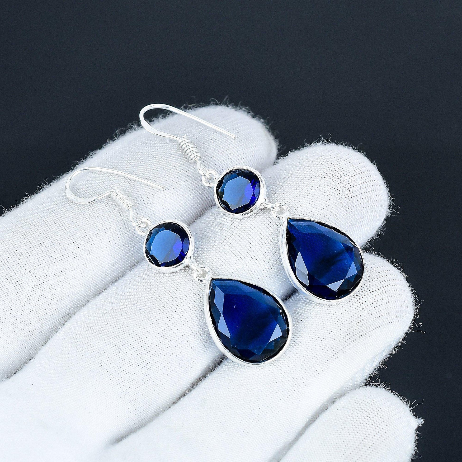 Crafted with precision, these earrings feature a stunning sapphire-like gemstone in a beautifully faceted teardrop shape.