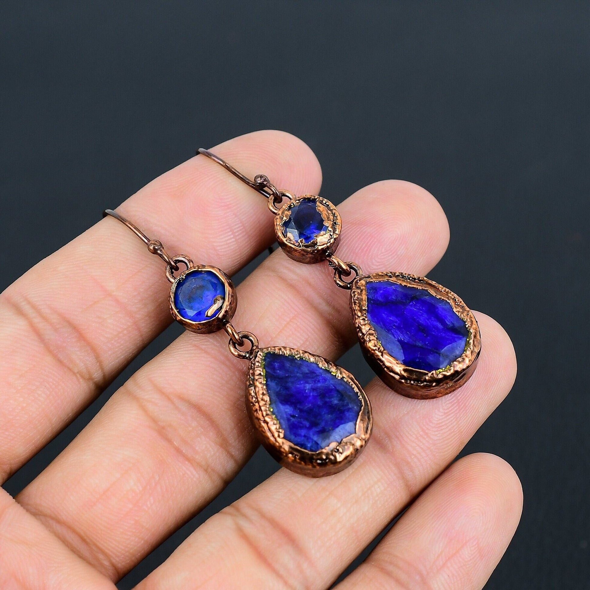 Each earring showcases a stunning faceted round and teardrop design, encased in a rustic copper setting, enhancing their rich, vintage appeal.