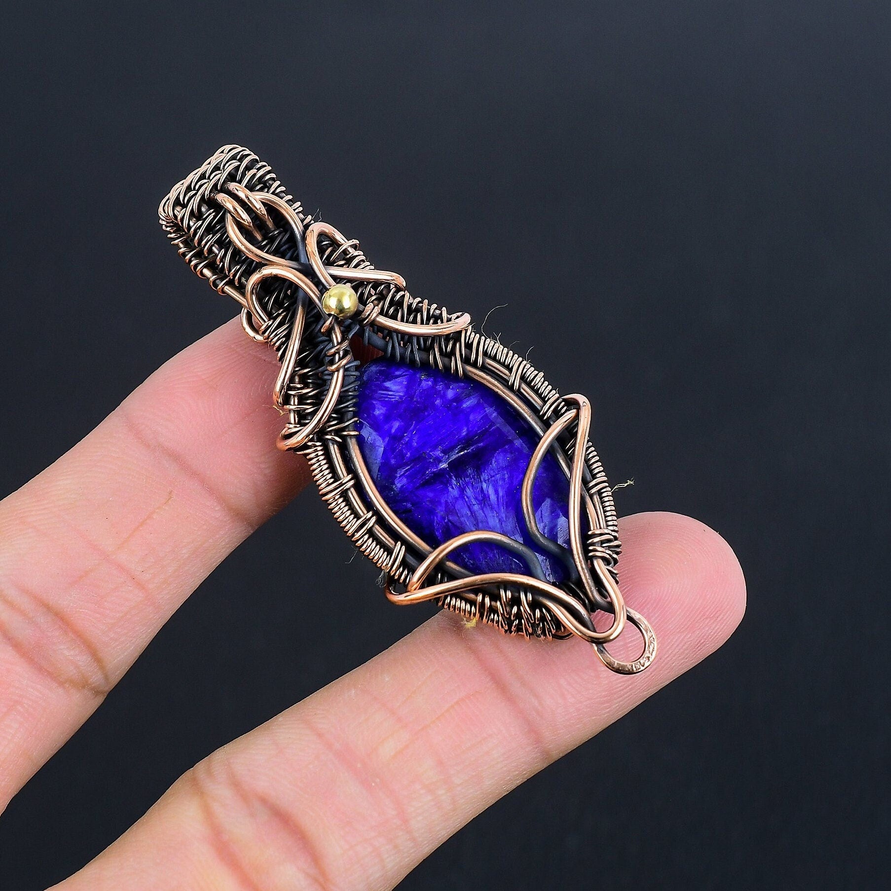 This exquisite piece features a vibrant deep blue stone, intricately wrapped in a complex weave of copper wire. Each detail showcases the meticulous craftsmanship involved in creating this unique accessory.
