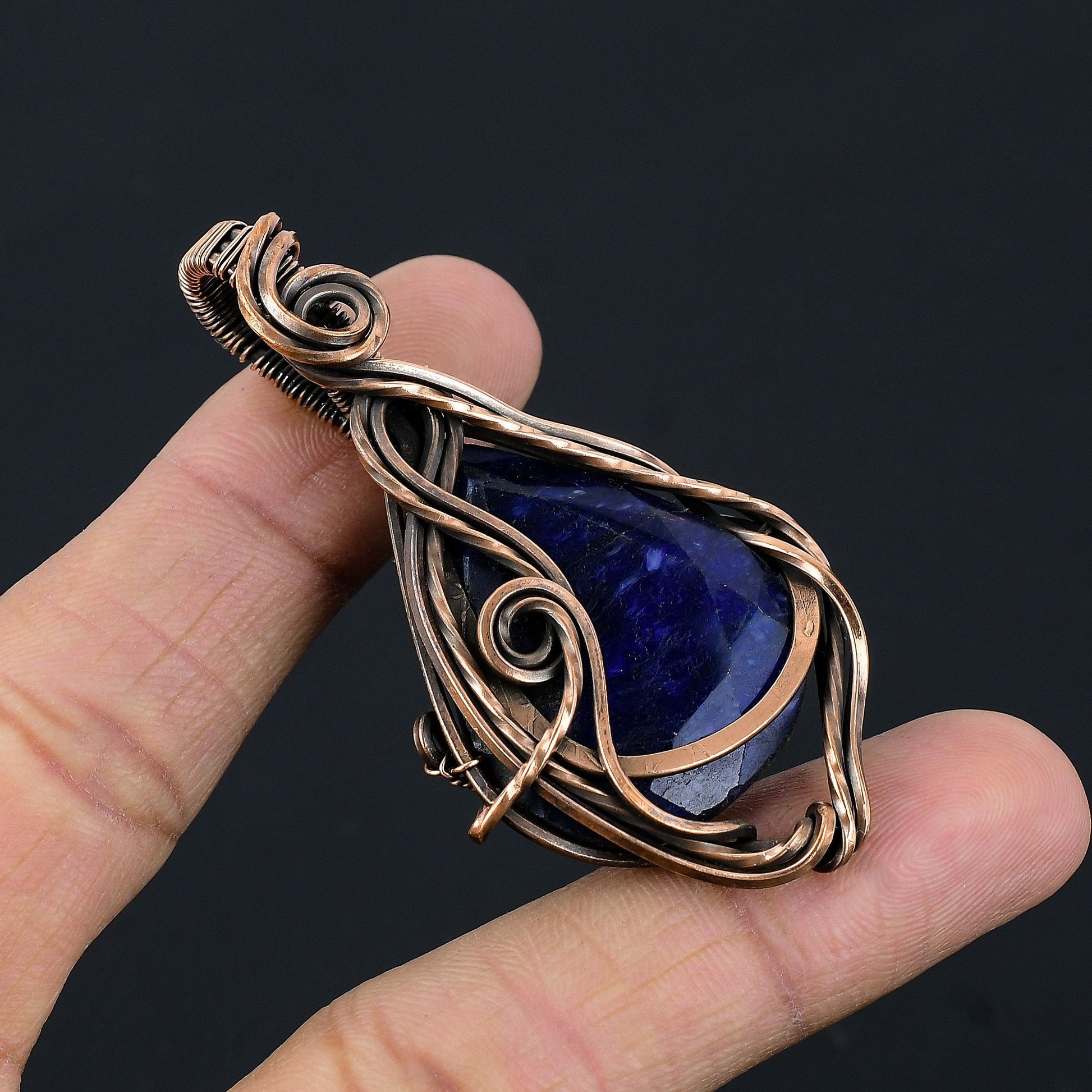 This exquisite piece features a deep blue, teardrop-shaped lapis lazuli stone, skillfully encased in a visually stunning swirl of copper design.