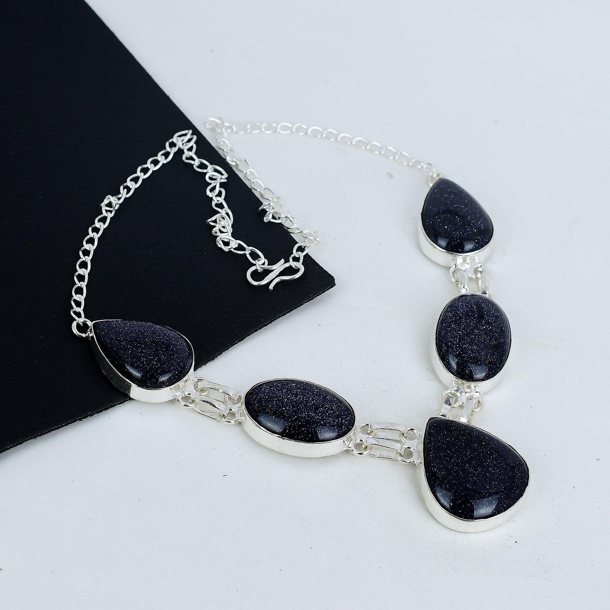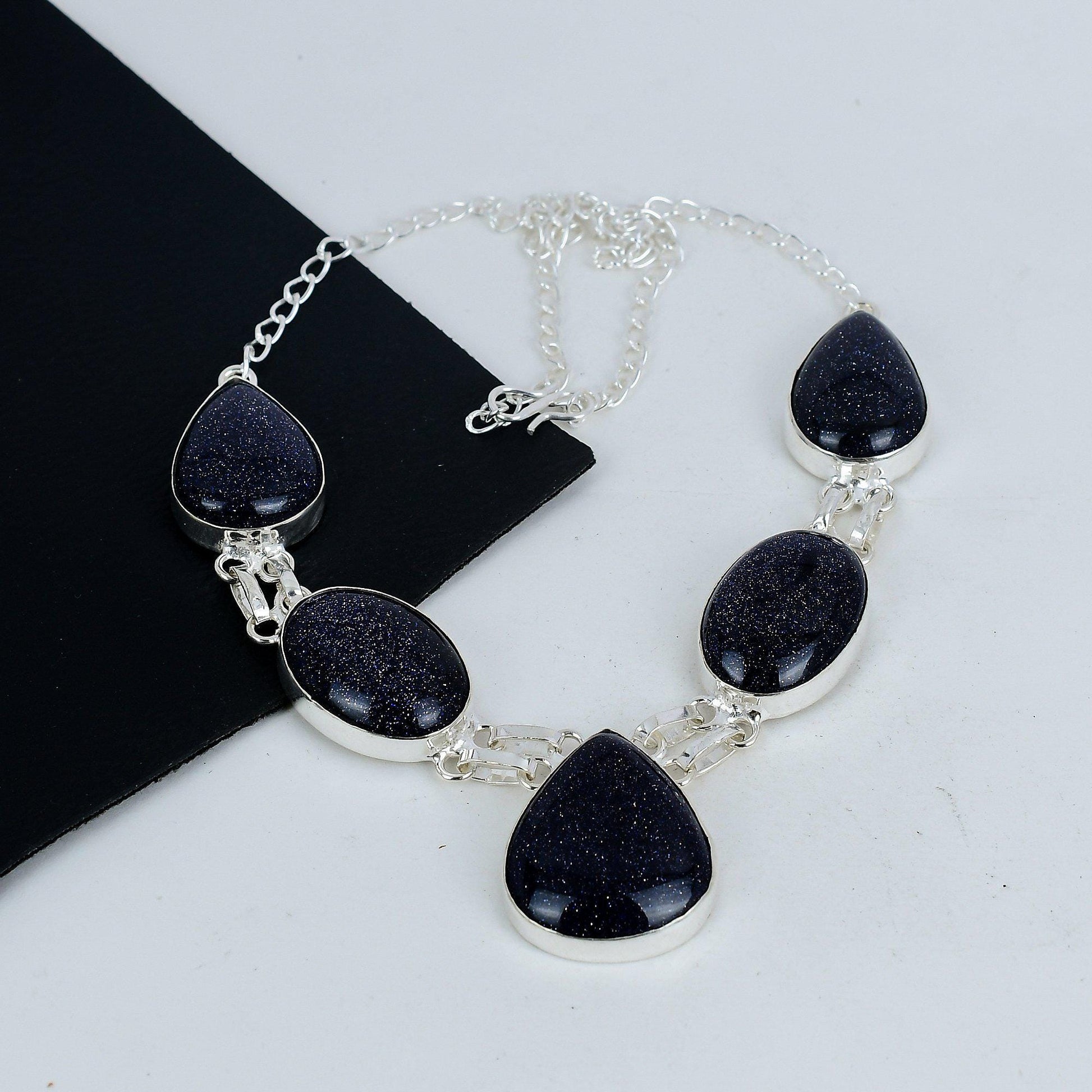 This stunning piece features shimmering blue sandstone gems, expertly set in a polished silver-tone frame that captures the essence of a starry night sky.