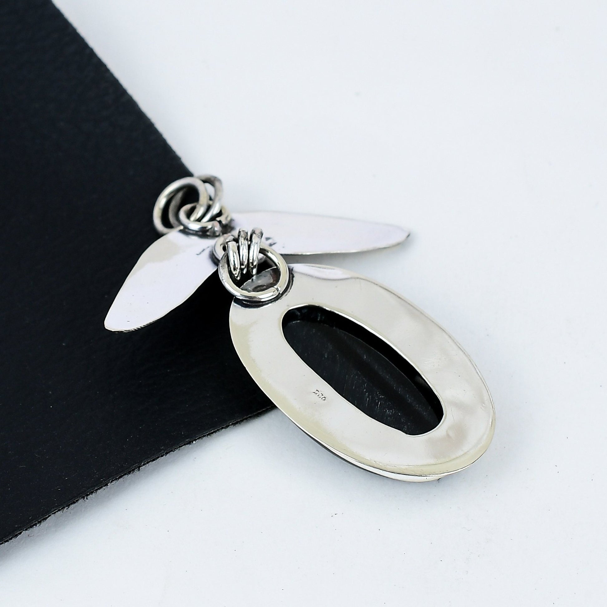 Discover the timeless elegance of our exquisite pendant, featuring a captivating deep blue stone set in a sleek silver frame. This piece is perfectly complemented by delicately crafted leaf embellishments, adding a touch of natural beauty and sophistication.