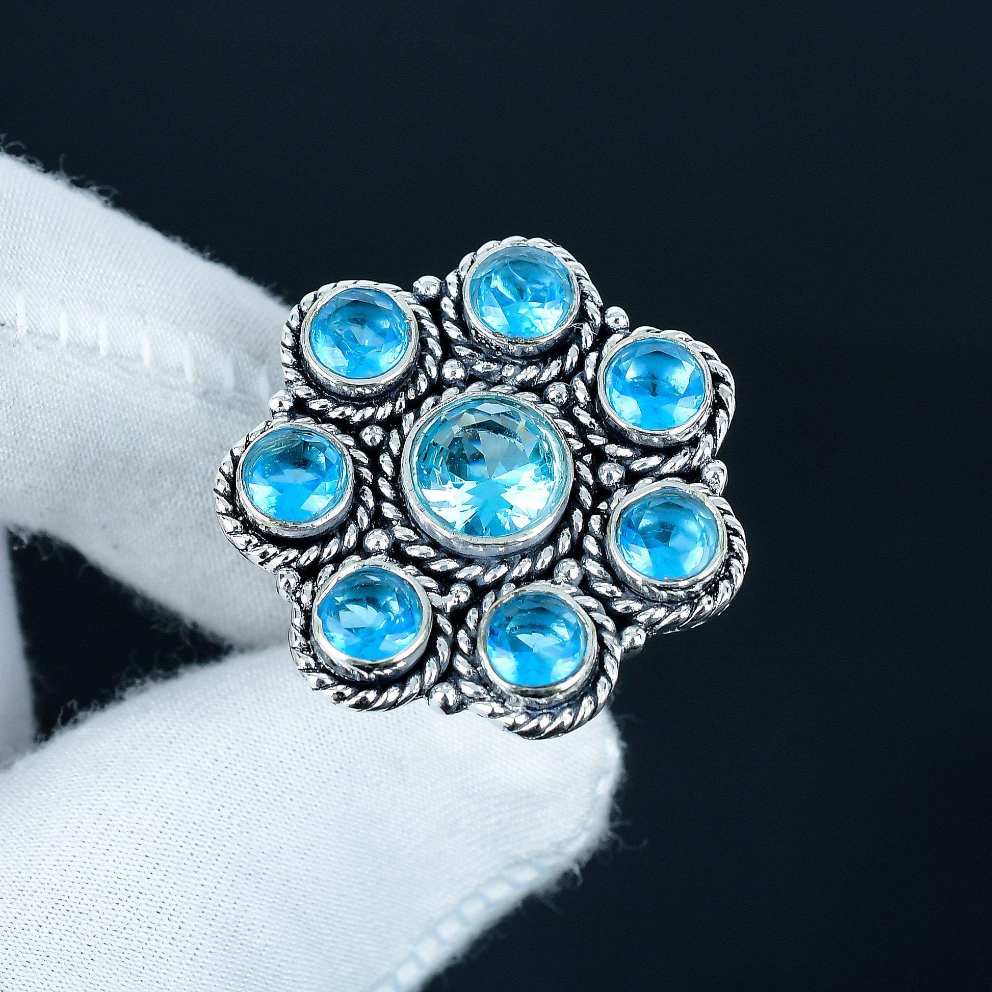 Crafted to perfection, this ring features a captivating floral design set with glistening blue topaz gemstones. The intricate silver detailing adds a touch of vintage charm, making it a unique addition to any jewelry collection.