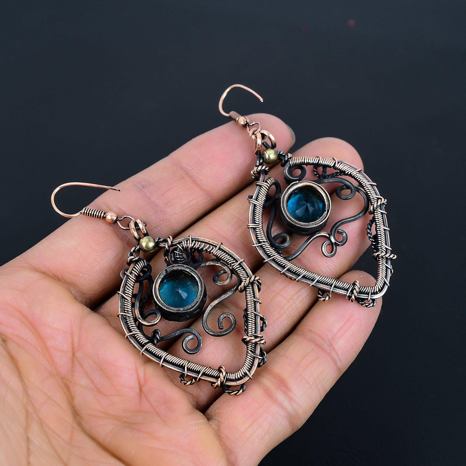 Design: Crafted with meticulous attention to detail, these earrings feature intricate copper wirework that elegantly frames a luminous blue gemstone at the center.