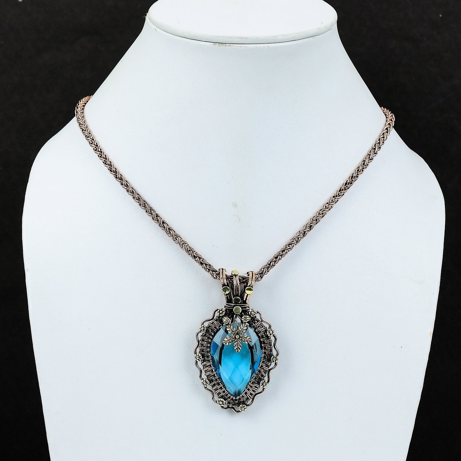 - Beautifully cut blue gemstone encased in a delicate, detailed wire wrap design.