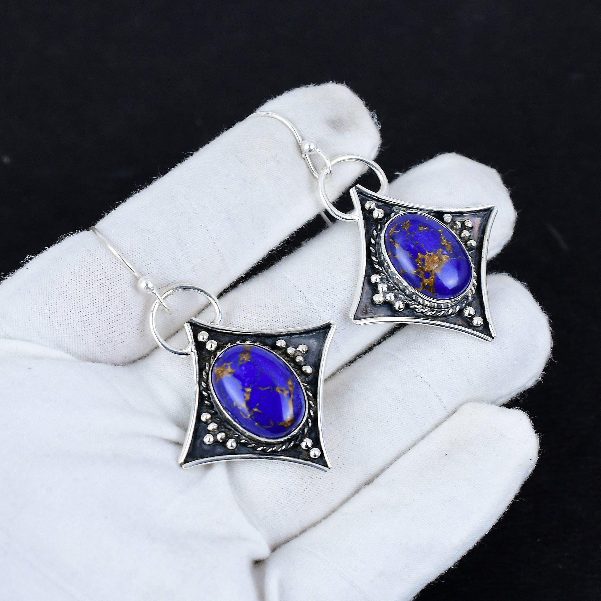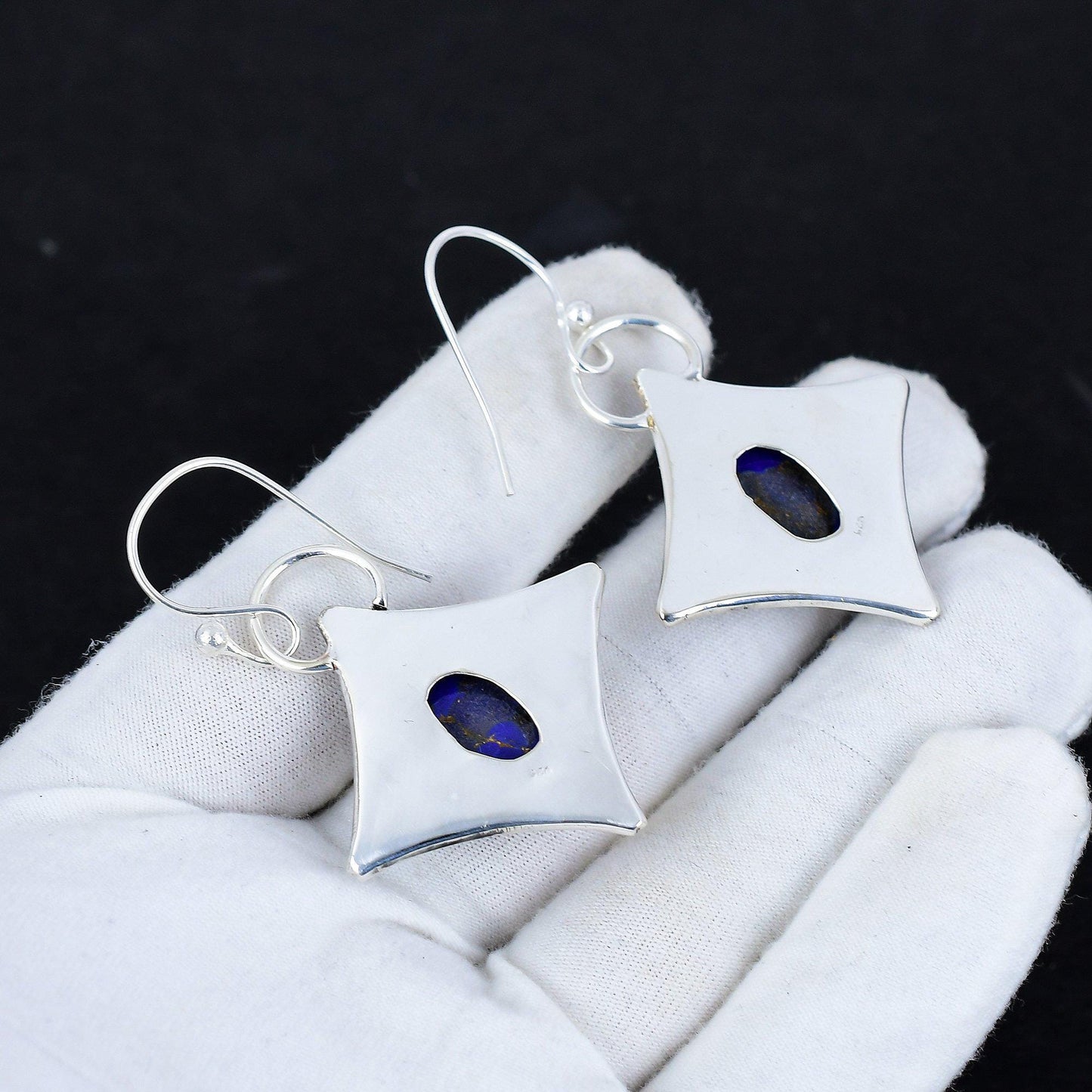 Enhance your elegance with these distinctive silver drop earrings. Featuring a mesmerizing blue stone, each piece is set in a unique, geometric design that exudes sophistication.