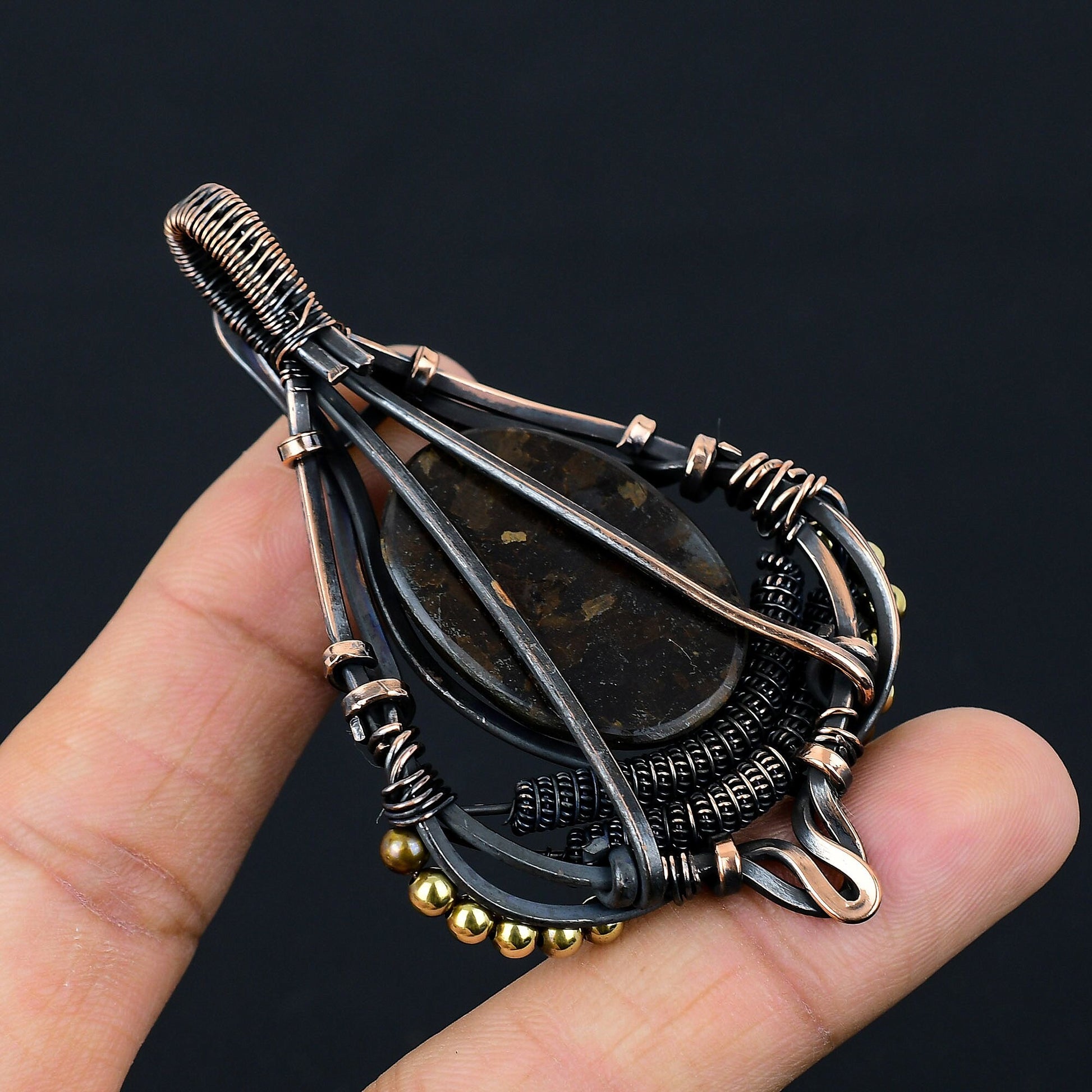 This exquisite piece features a captivating central stone, beautifully encased in intricately twisted wire. The dark, metallic tones provide a striking contrast, making the pendant a standout accessory for any ensemble.