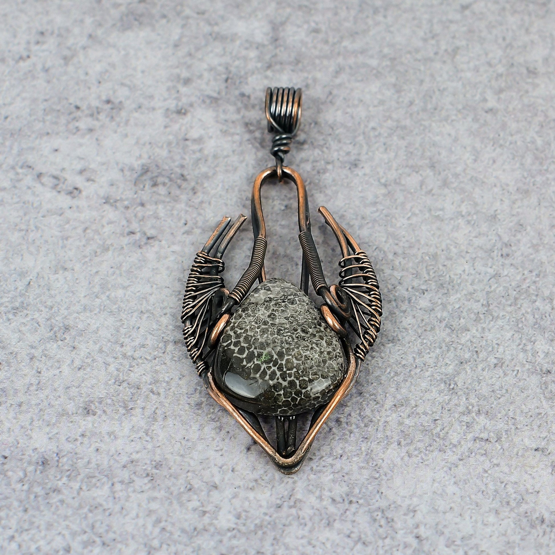 Unveil the timeless beauty of this handcrafted copper wire-wrapped pendant. Featuring an exquisite stone centerpiece, the intricate design showcases meticulous craftsmanship.