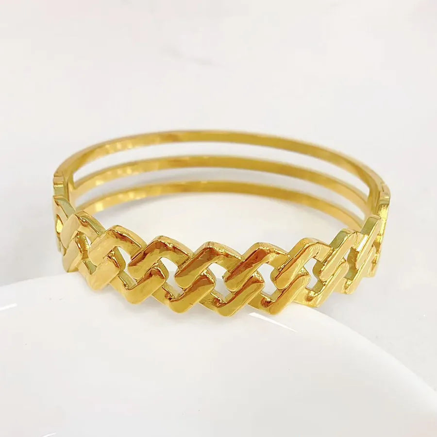 Featuring a unique interlocking design, this bangle showcases precise craftsmanship and an eye-catching pattern that stands out. Its lustrous gold finish adds a touch of luxury to any outfit, making it an ideal accessory for both casual and formal occasions.