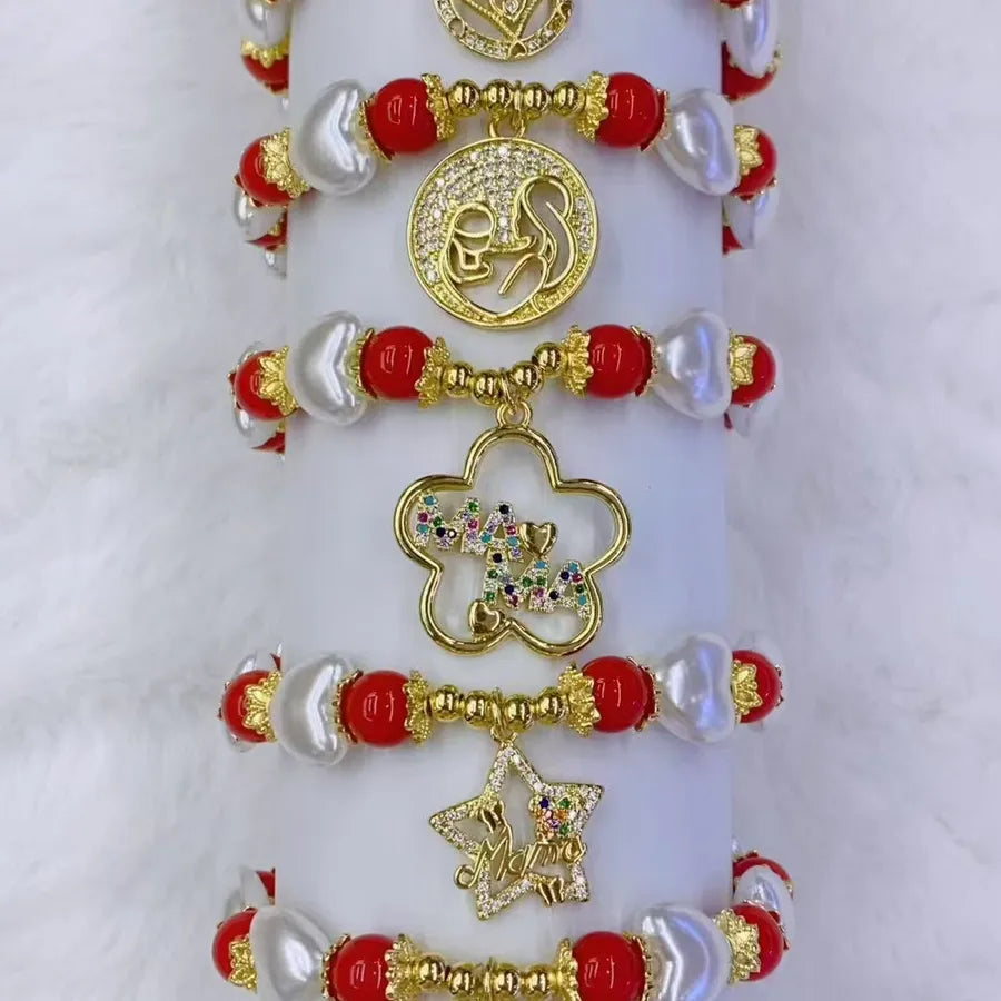 Each bracelet features a stunning combination of vibrant red beads and lustrous pearl accents, seamlessly interspersed with intricately crafted gold elements.