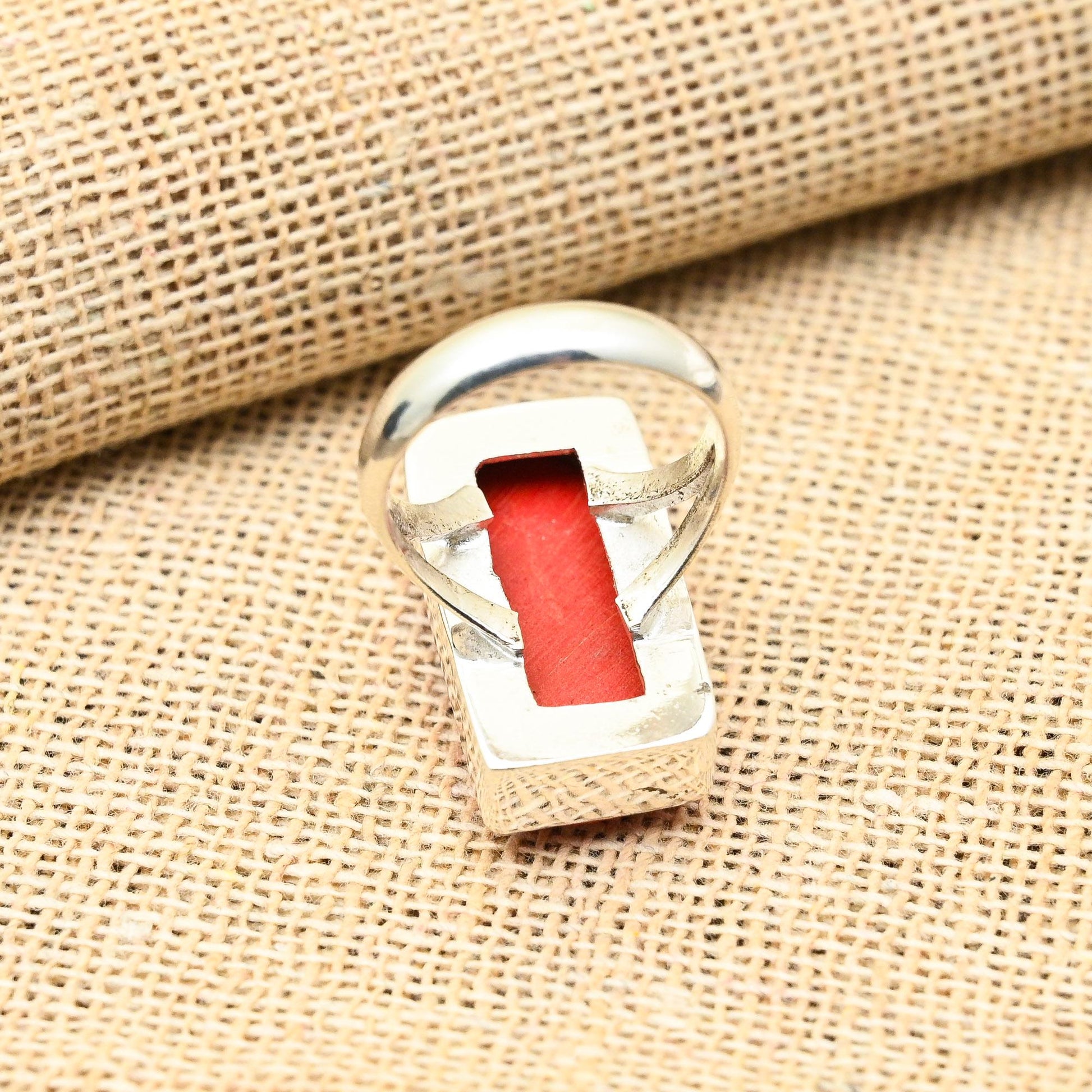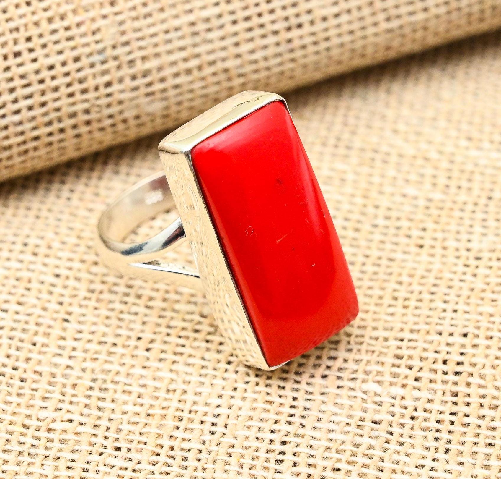Indulge in elegance with our stunning rectangular red coral ring.