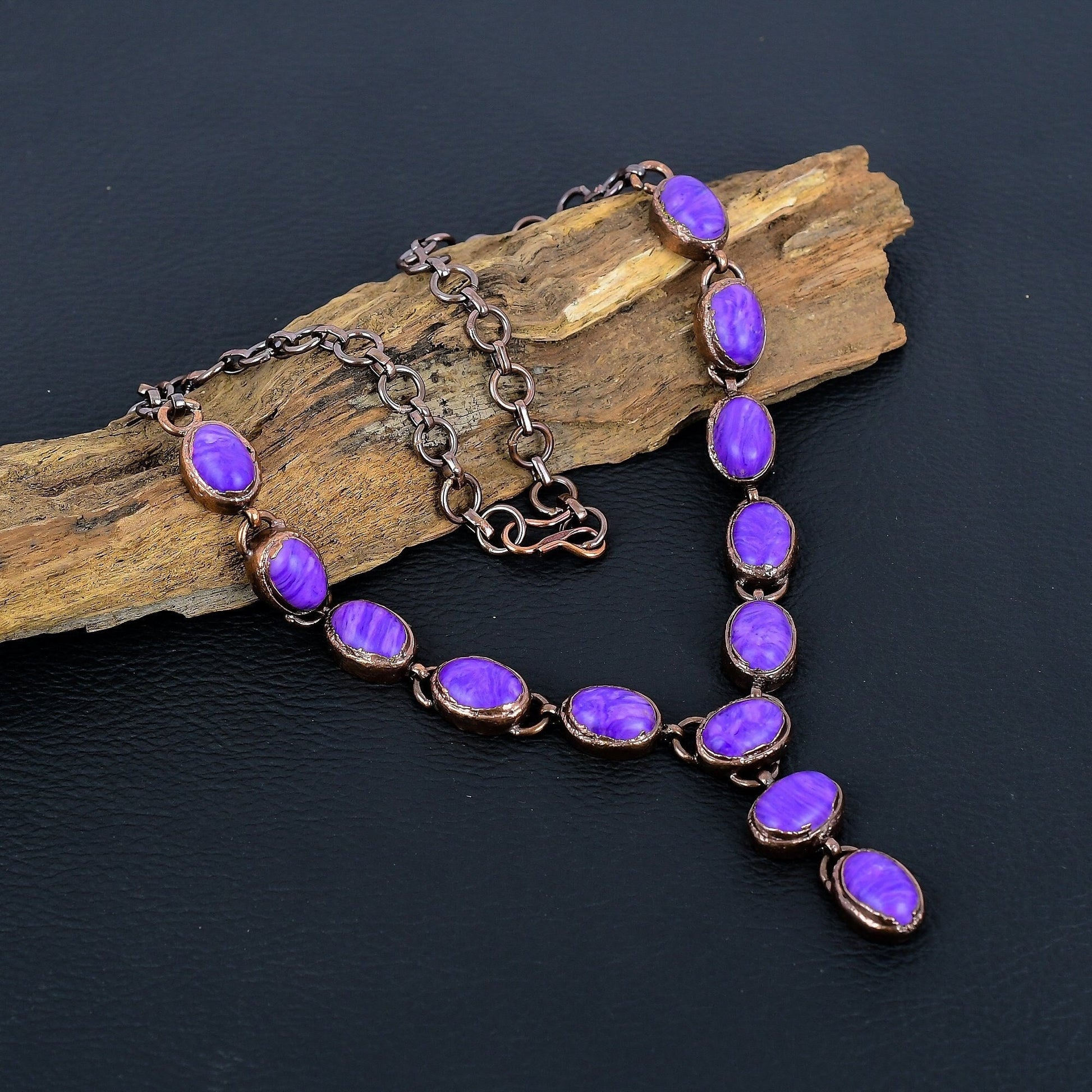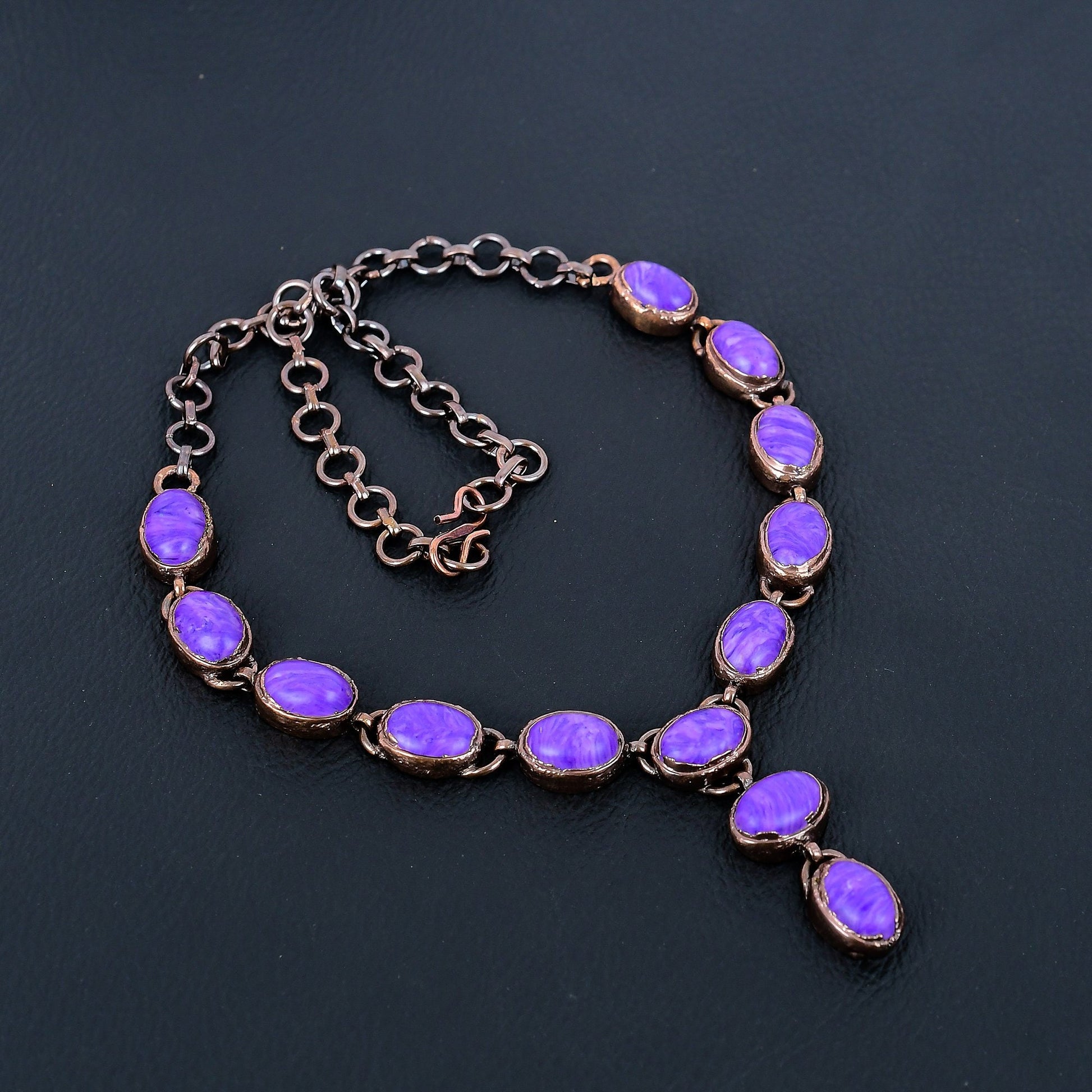 This exquisite piece features ten vibrant purple gemstones, intricately set in a timeless copper finish, exuding both luxury and charm.