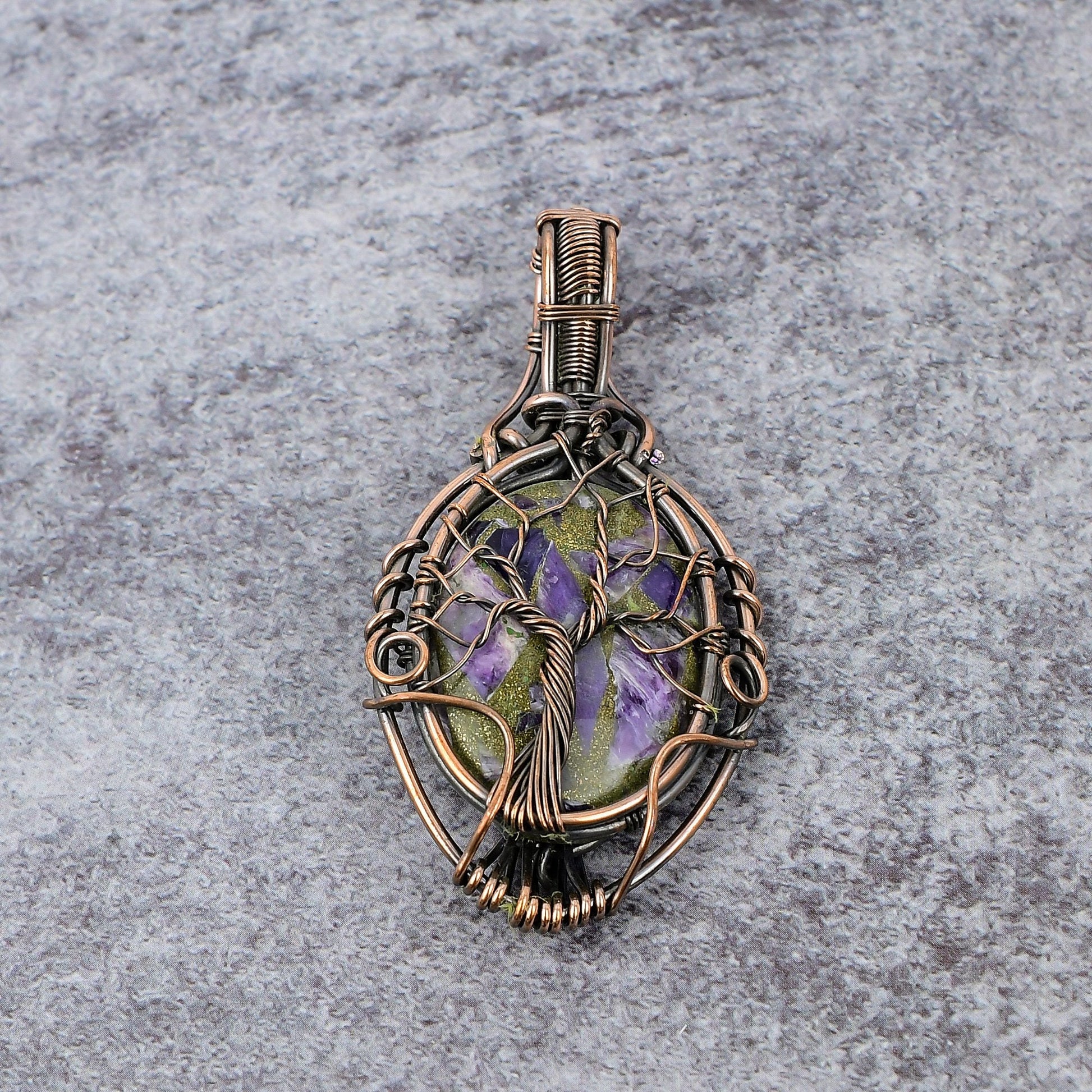 Design: This exquisite pendant features an intricately woven wire tree over a stunning purple and green gemstone, symbolizing growth and harmony. The fine detailing of the branches and trunk showcases unparalleled craftsmanship.