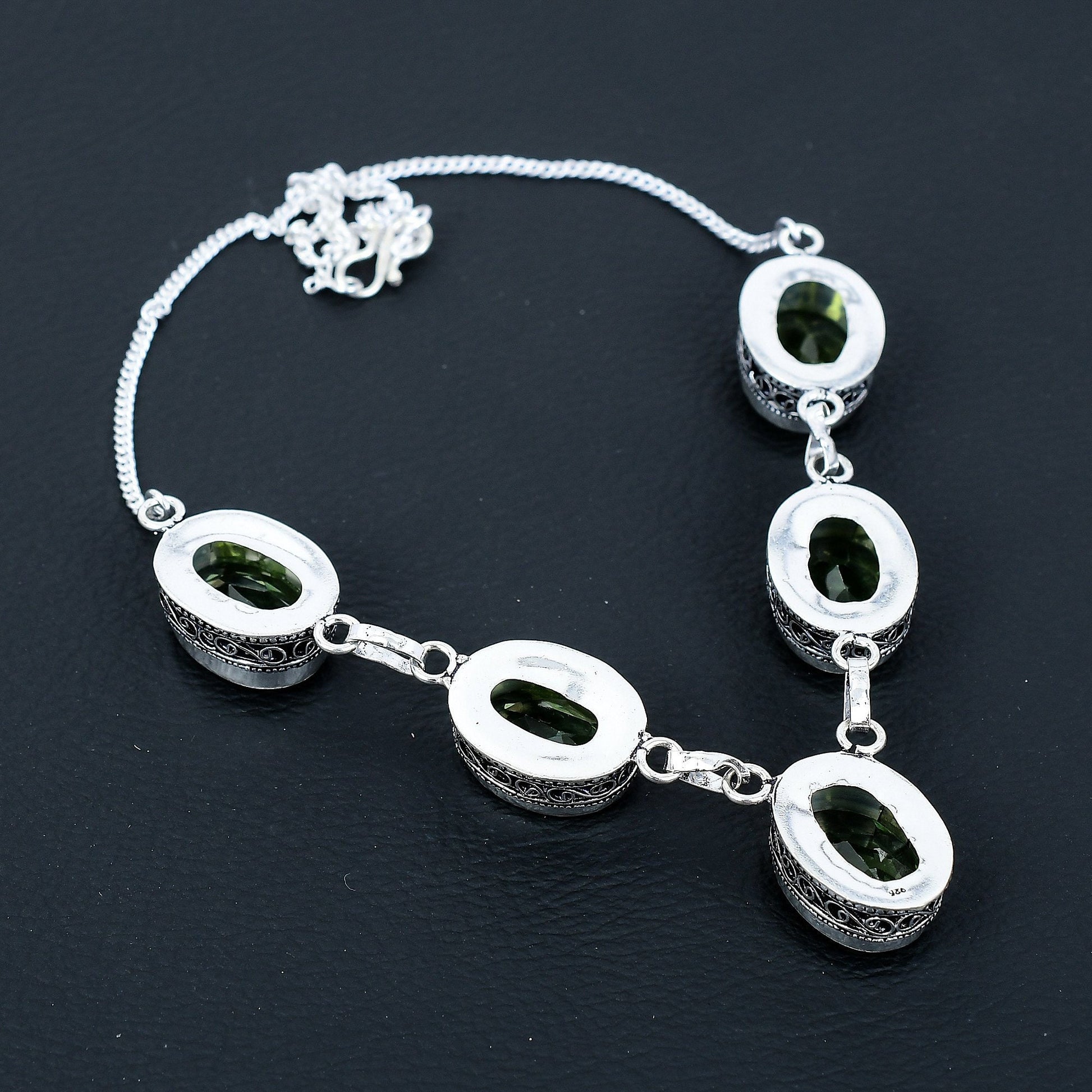 Step into elegance with this exquisite silver necklace, adorned with dazzling green gemstones.