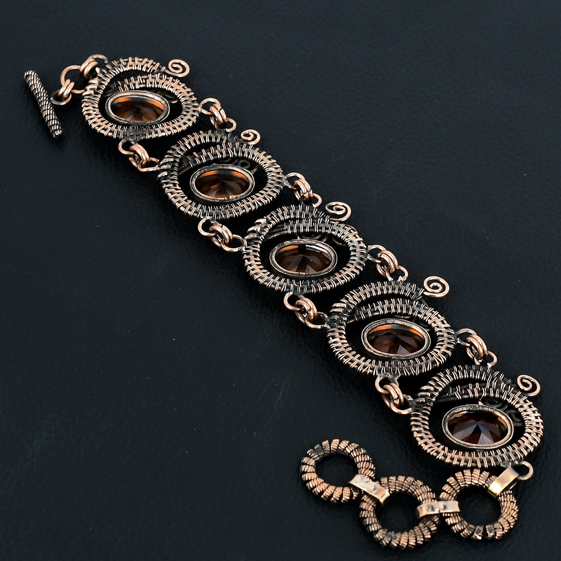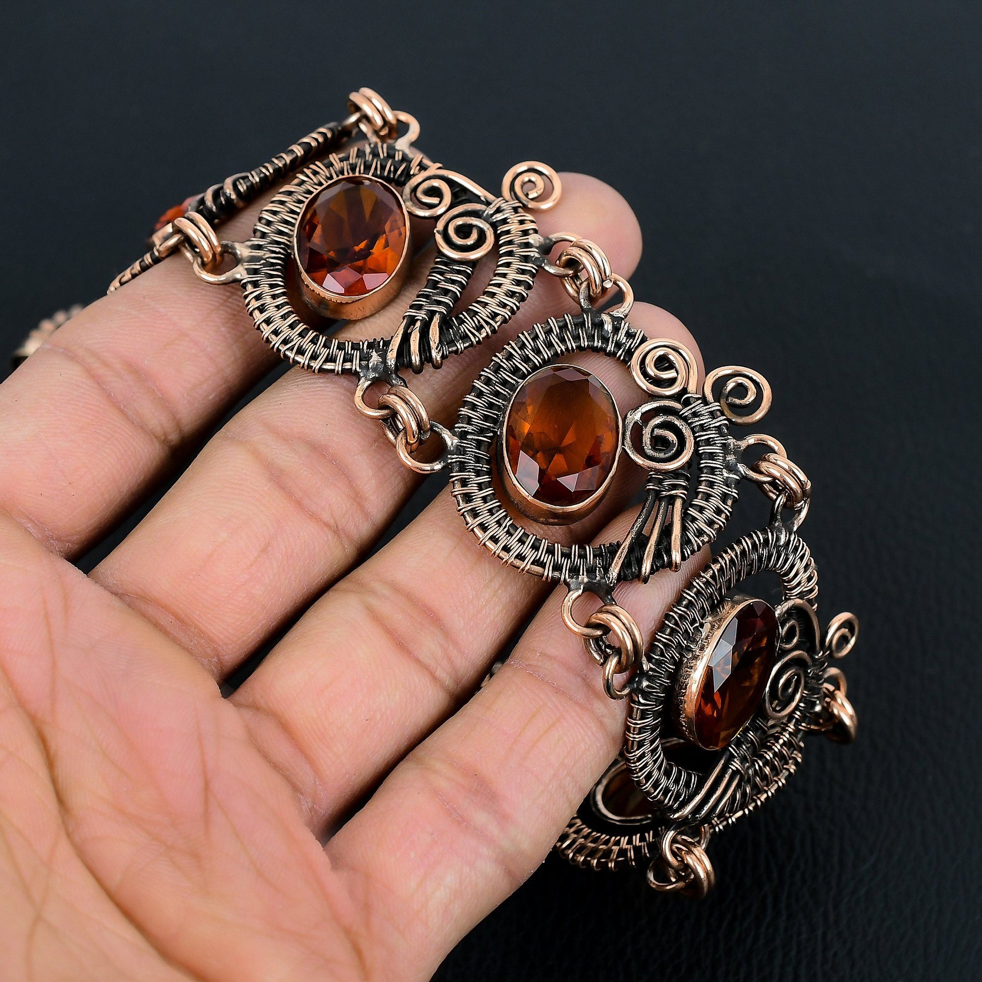 Embrace elegance with this stunning handcrafted copper bracelet, featuring intricate wirework that beautifully cradles rich amber gemstones.