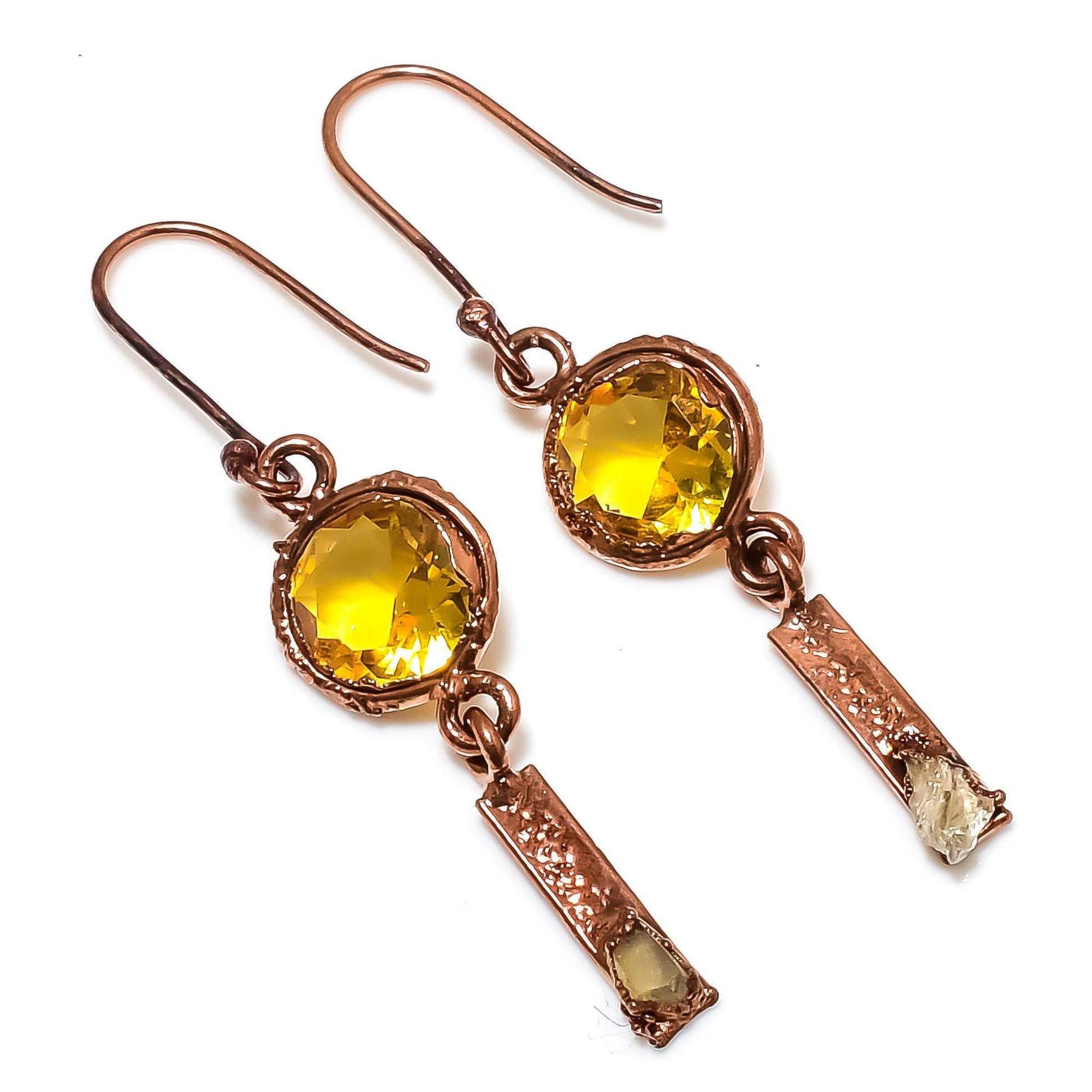 Enhance your elegance with these exquisite handcrafted earrings, featuring vibrant yellow gemstones encased in a warm, rose gold-tone setting.