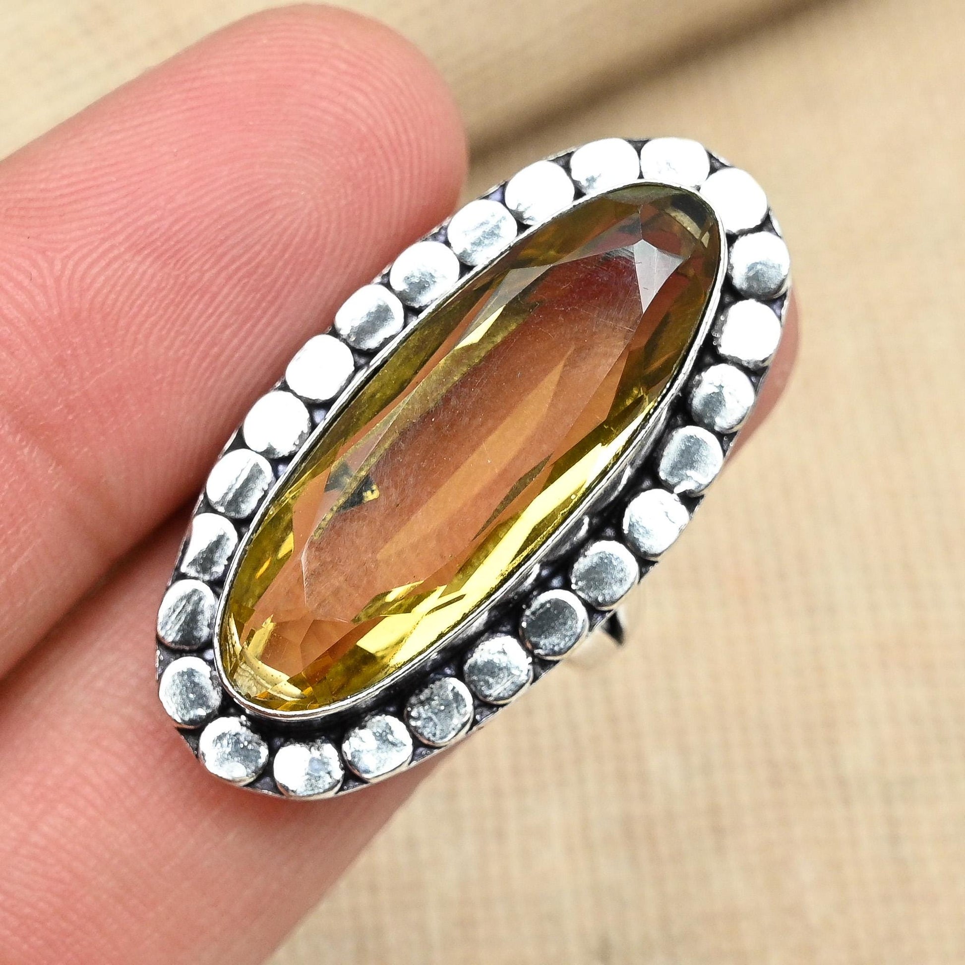 Elevate your style with this captivating sterling silver ring, featuring a striking marquise-cut yellow gemstone. Encircled by an intricate, vintage-inspired metal bezel, this piece evokes timeless elegance and sophistication.