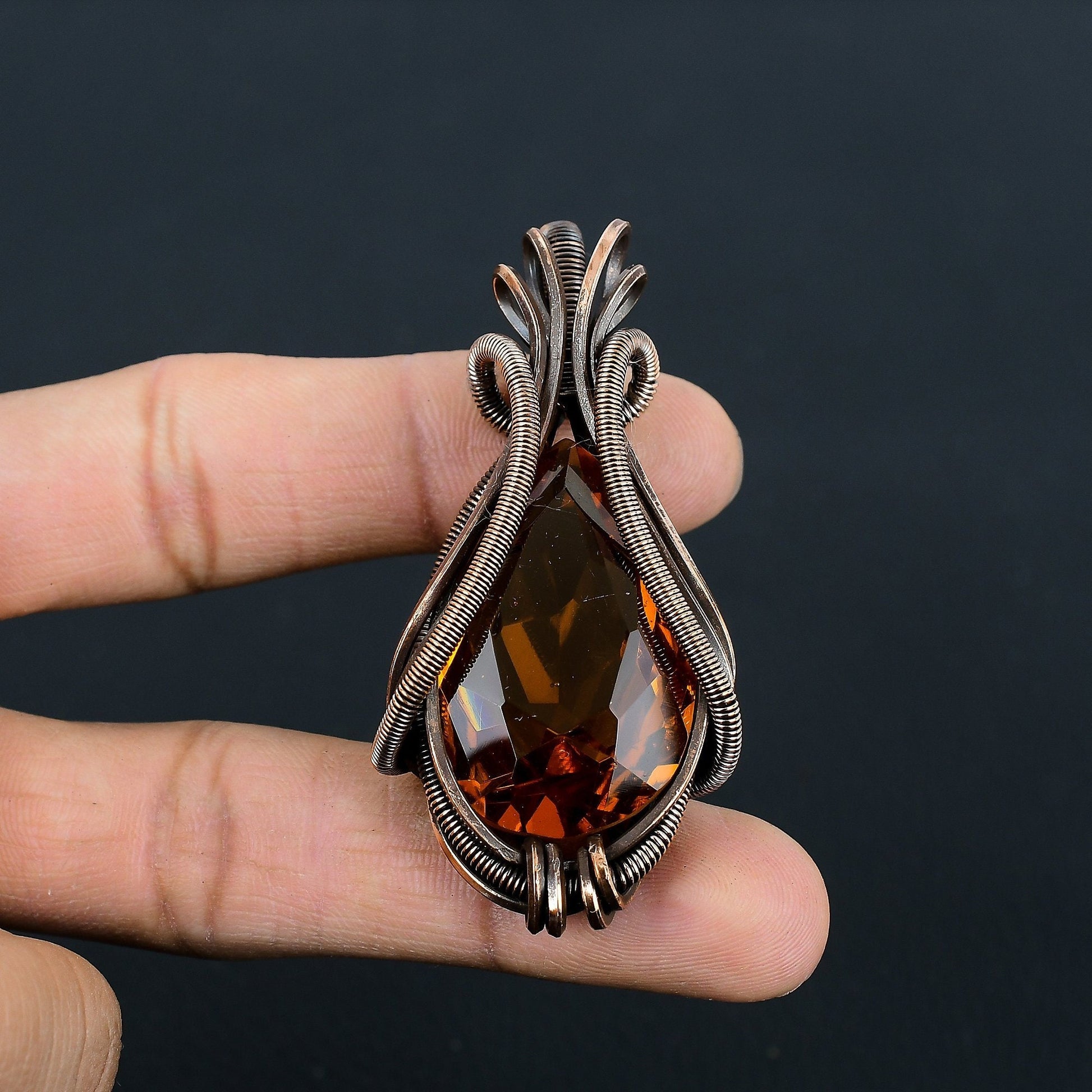 Unveil a touch of elegance with this meticulously crafted copper wire wrapped pendant. Featuring a stunning, teardrop-shaped gemstone, this piece is a true work of art.