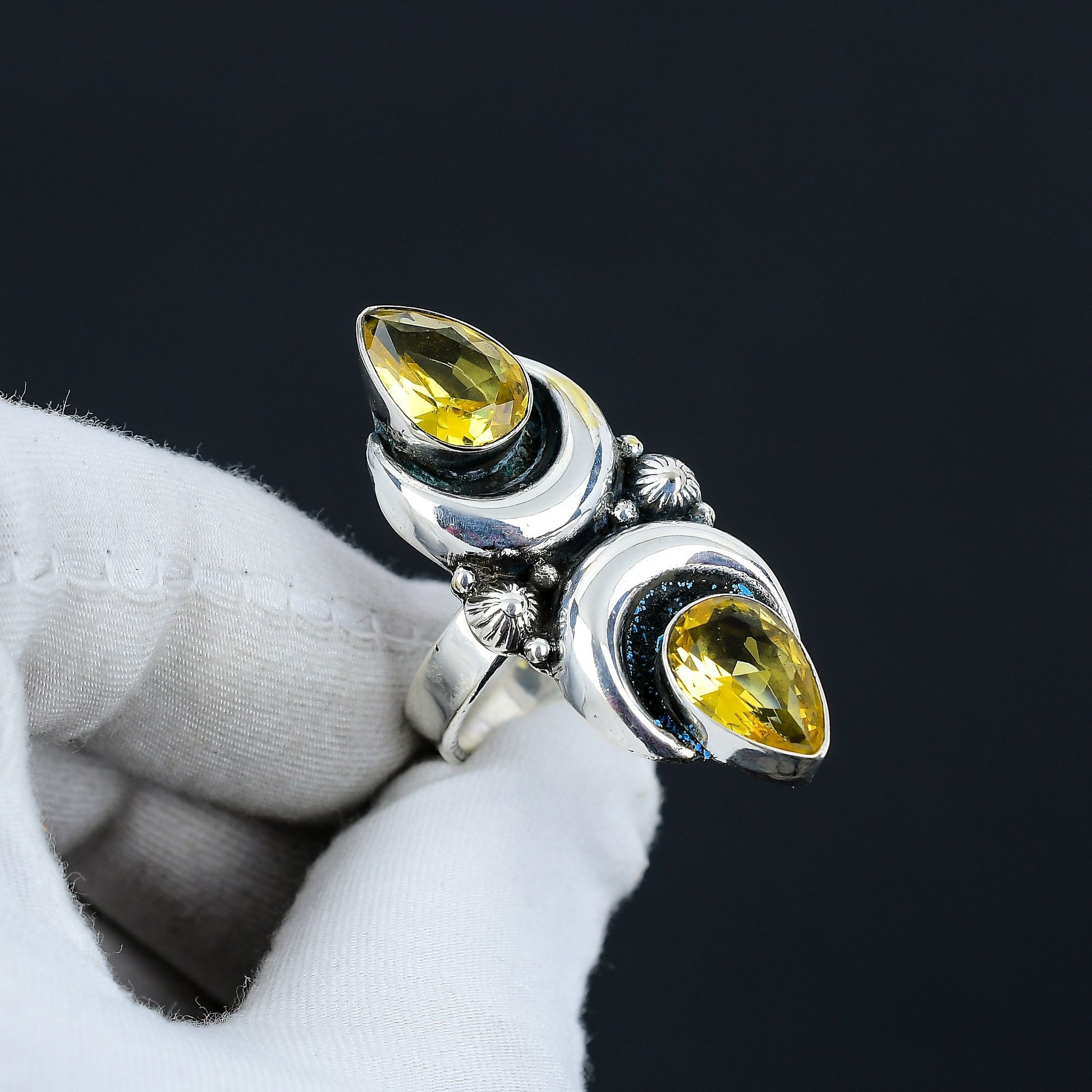 Elevate your style with our exquisite handcrafted dual gemstone ring, featuring dazzling teardrop-shaped yellow stones set in a lustrous sterling silver band.