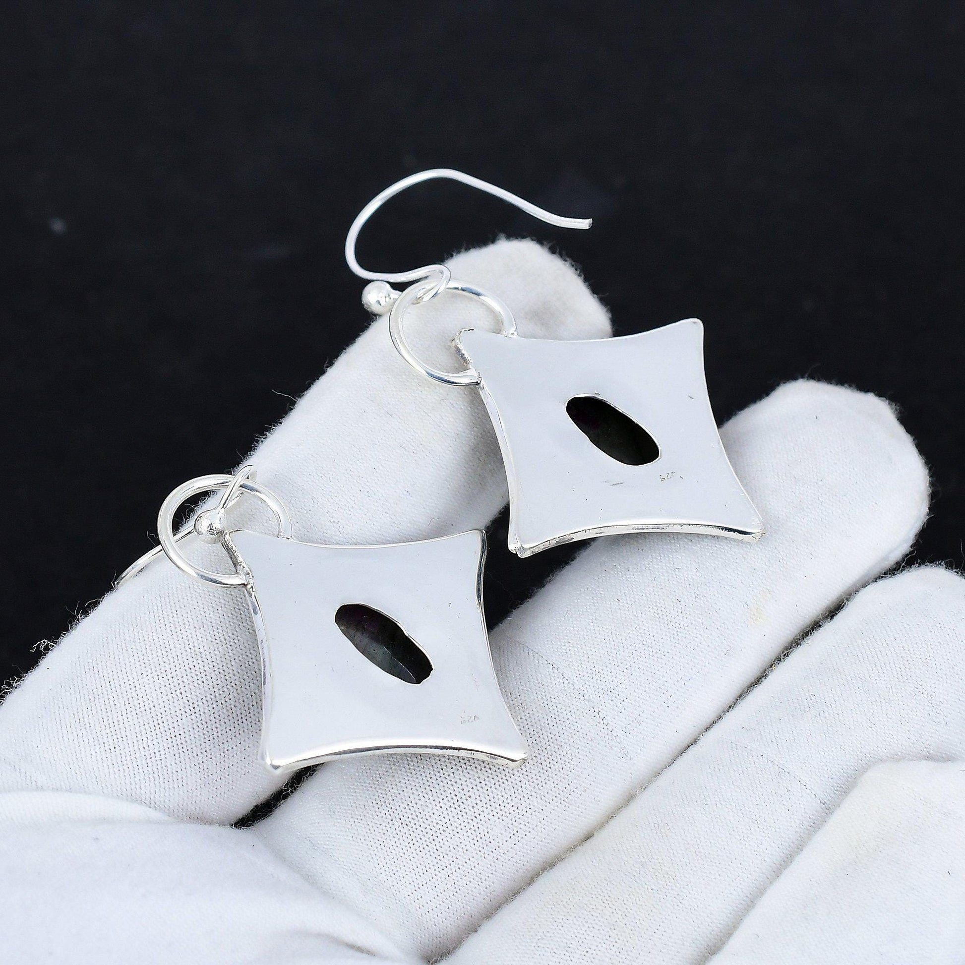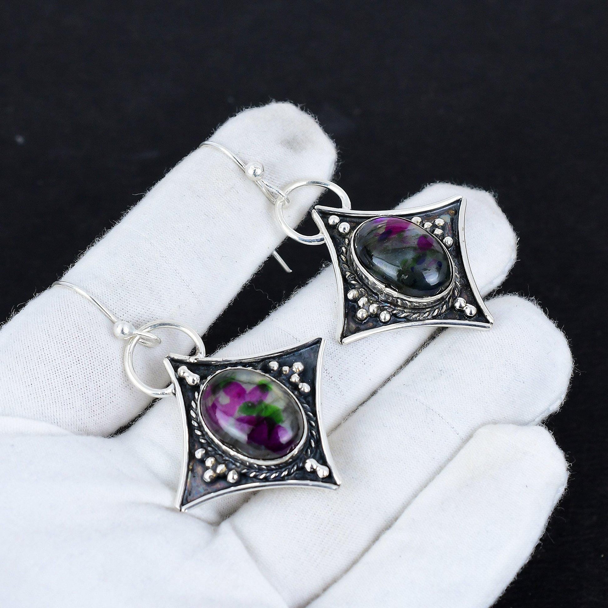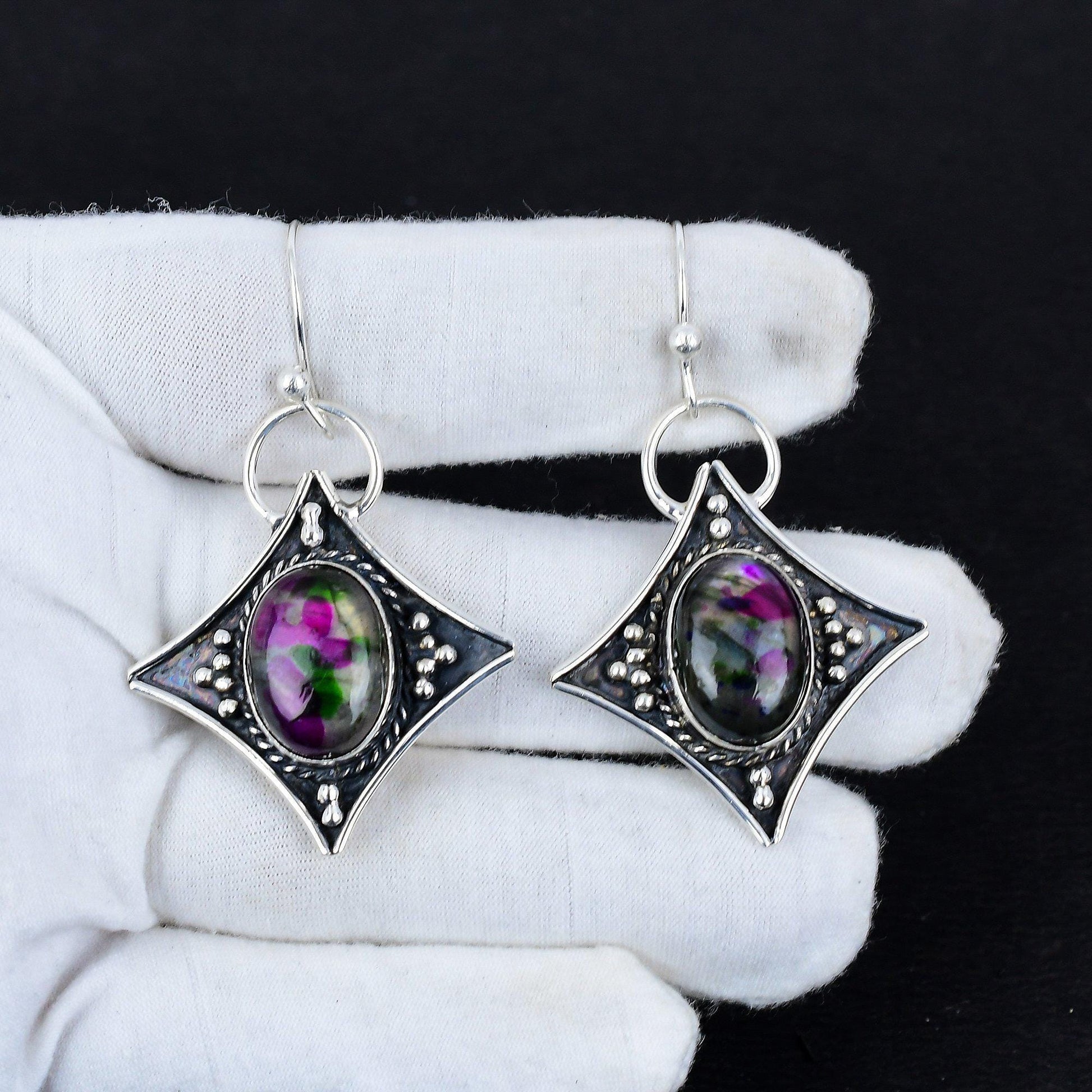 Exquisite Design: Each earring showcases a striking oval gemstone that captures an eye-catching blend of deep purples and greens, set in an intricately detailed silver frame.