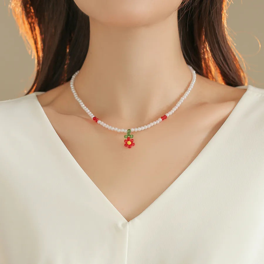 The centerpiece features a charming floral design in vibrant red and green, adding a touch of playful elegance to any outfit.