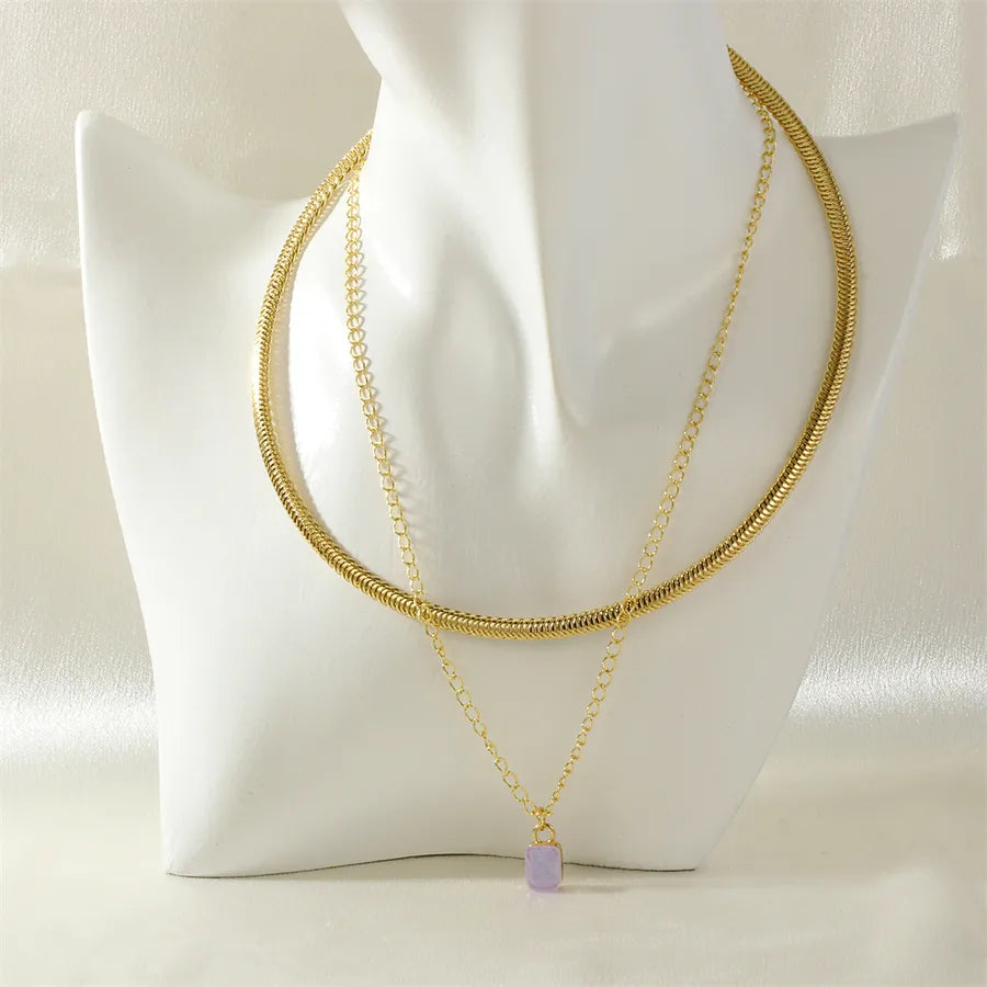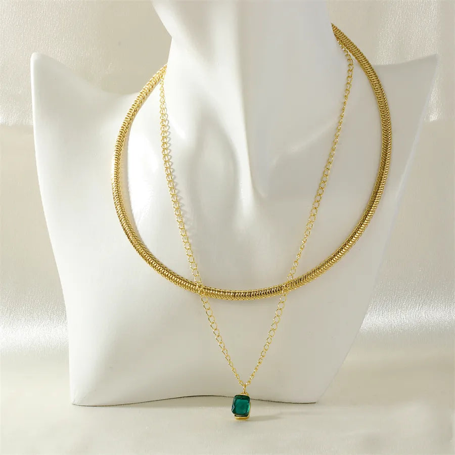 The second layer showcases a delicate gold chain that elegantly hangs a stunning green gemstone pendant, radiating a sense of timeless beauty and charm.