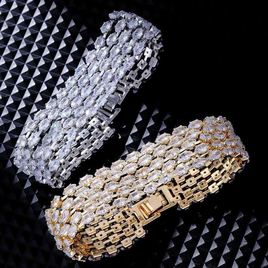 Indulge in elegance with our stunning luxury bracelets, available in both a shimmering silver and an opulent gold finish. These exquisite pieces are crafted with precision, featuring intricately arranged gemstones that catch the light from every angle.