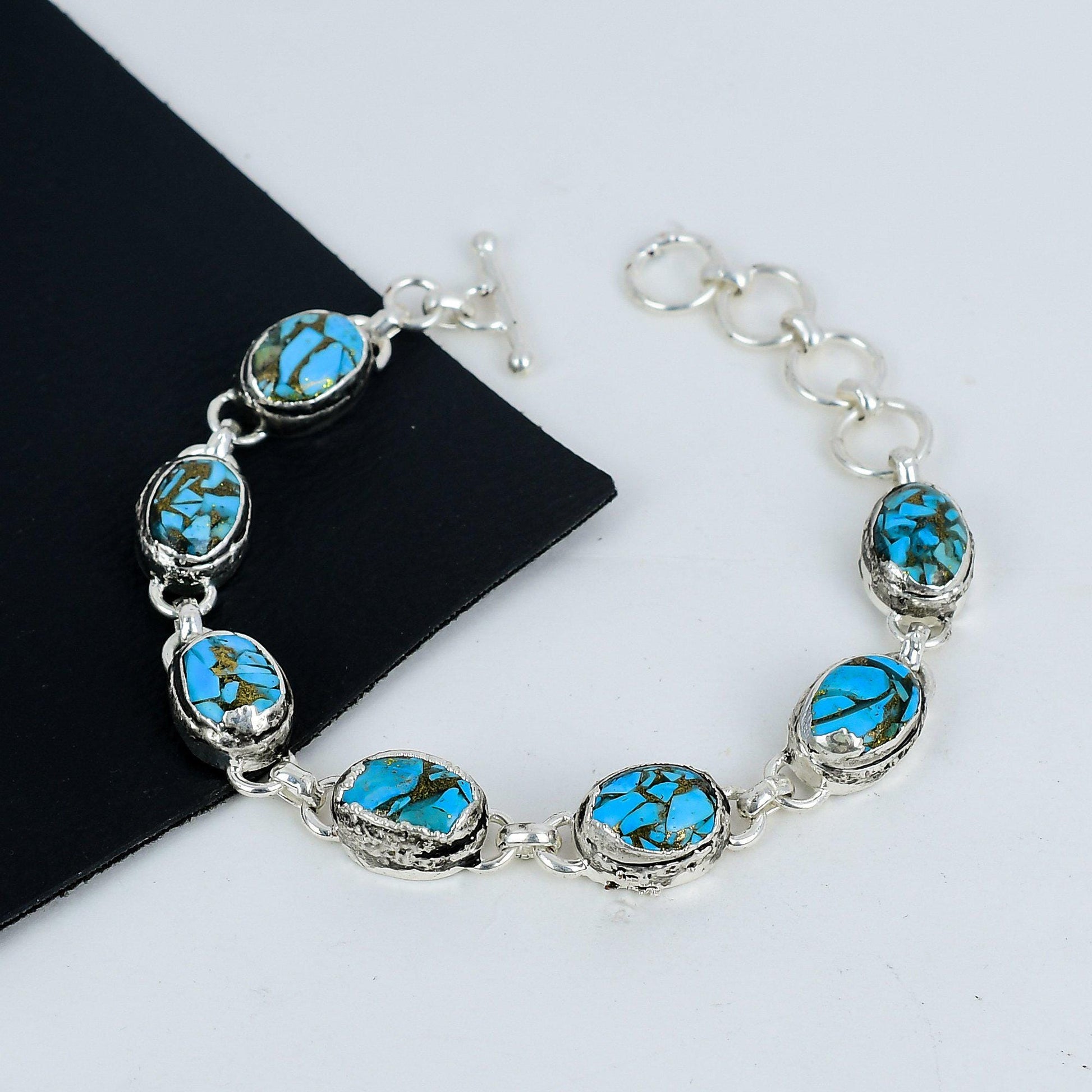 The bracelet features vibrant turquoise stones, set in a high-quality silver band for a striking contrast and lasting durability.