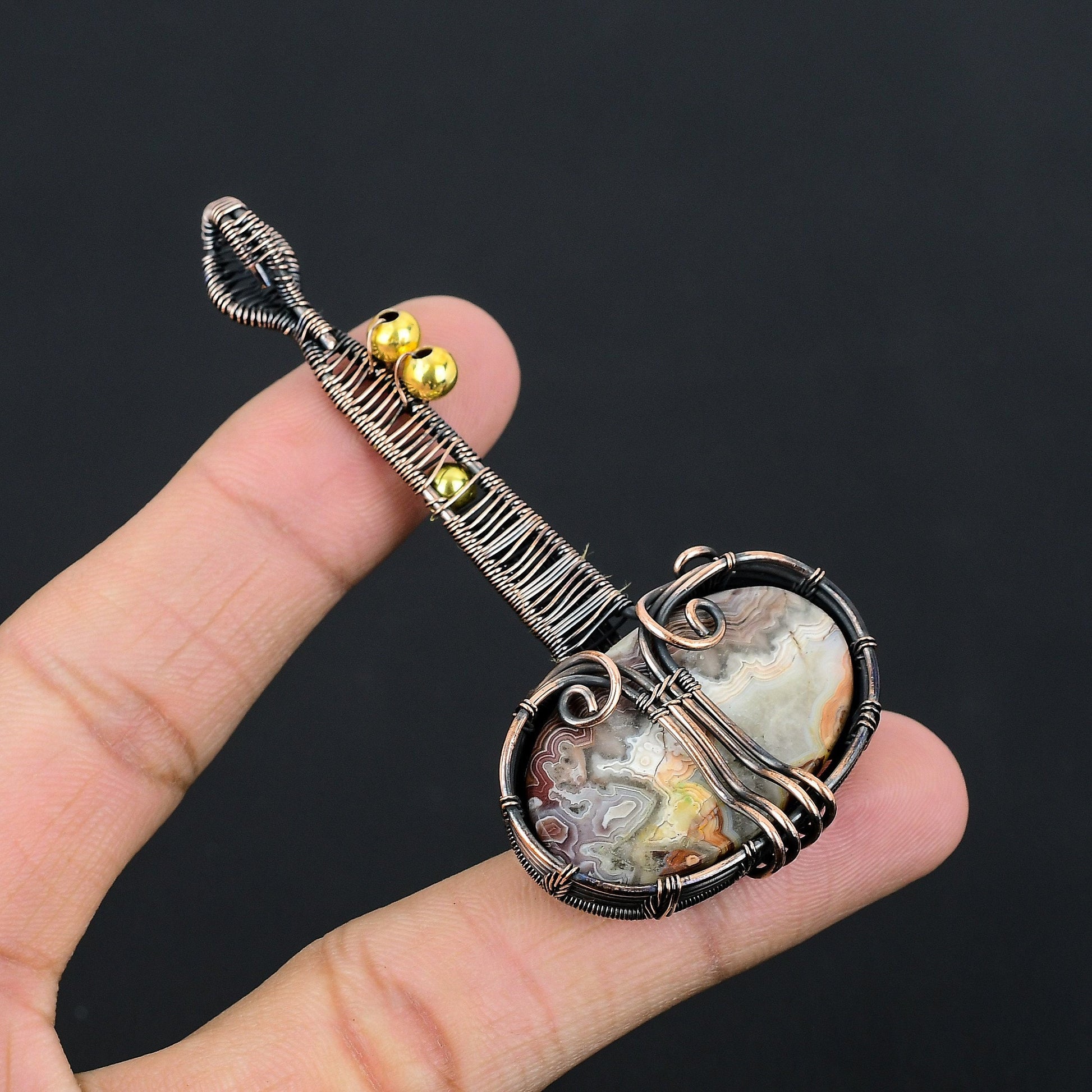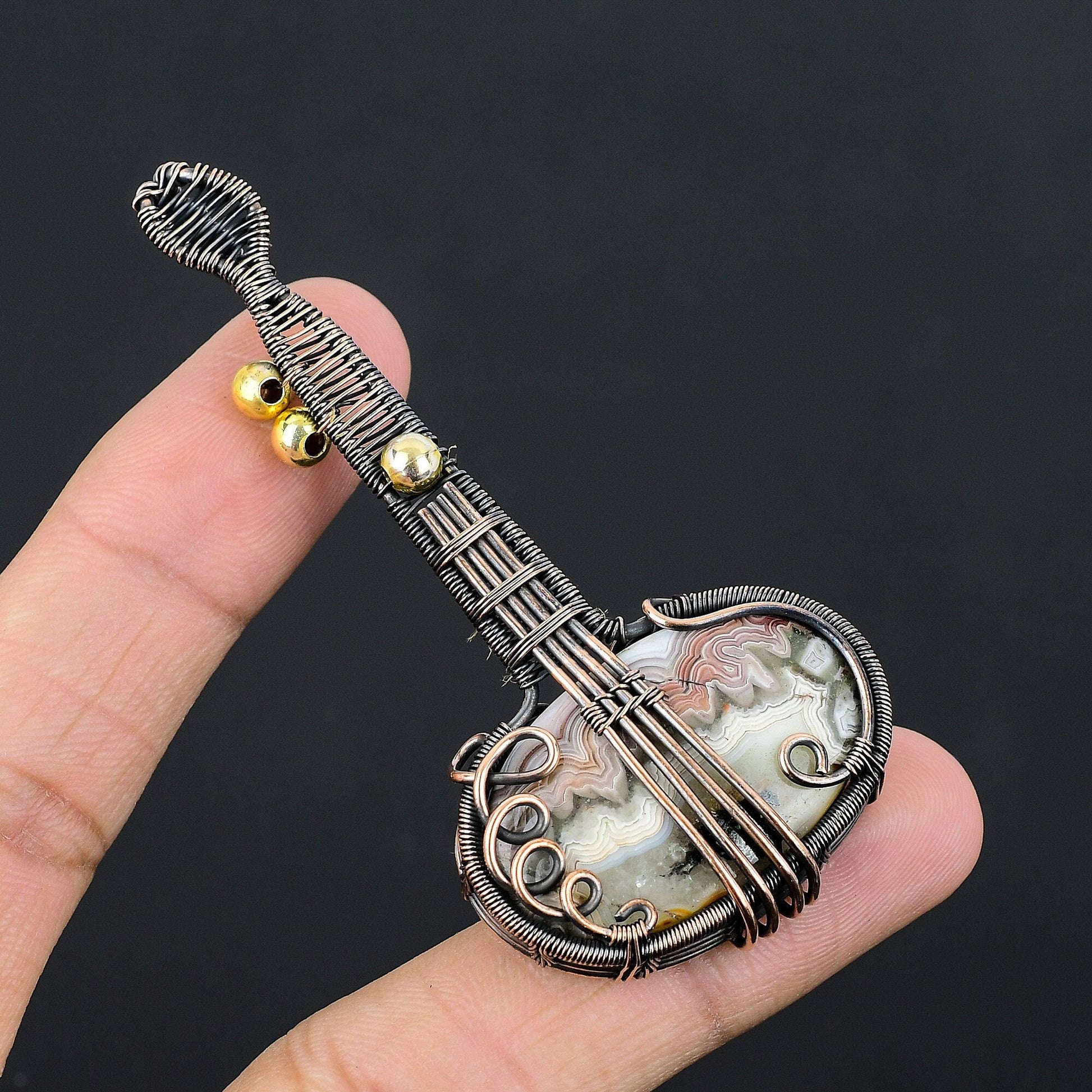 Elegant and uniquely designed, this exquisite guitar-shaped pendant is a harmonious blend of artistic craftsmanship and natural beauty. Featuring an intricate wire-wrapped design, it highlights the artisanship and attention to detail.