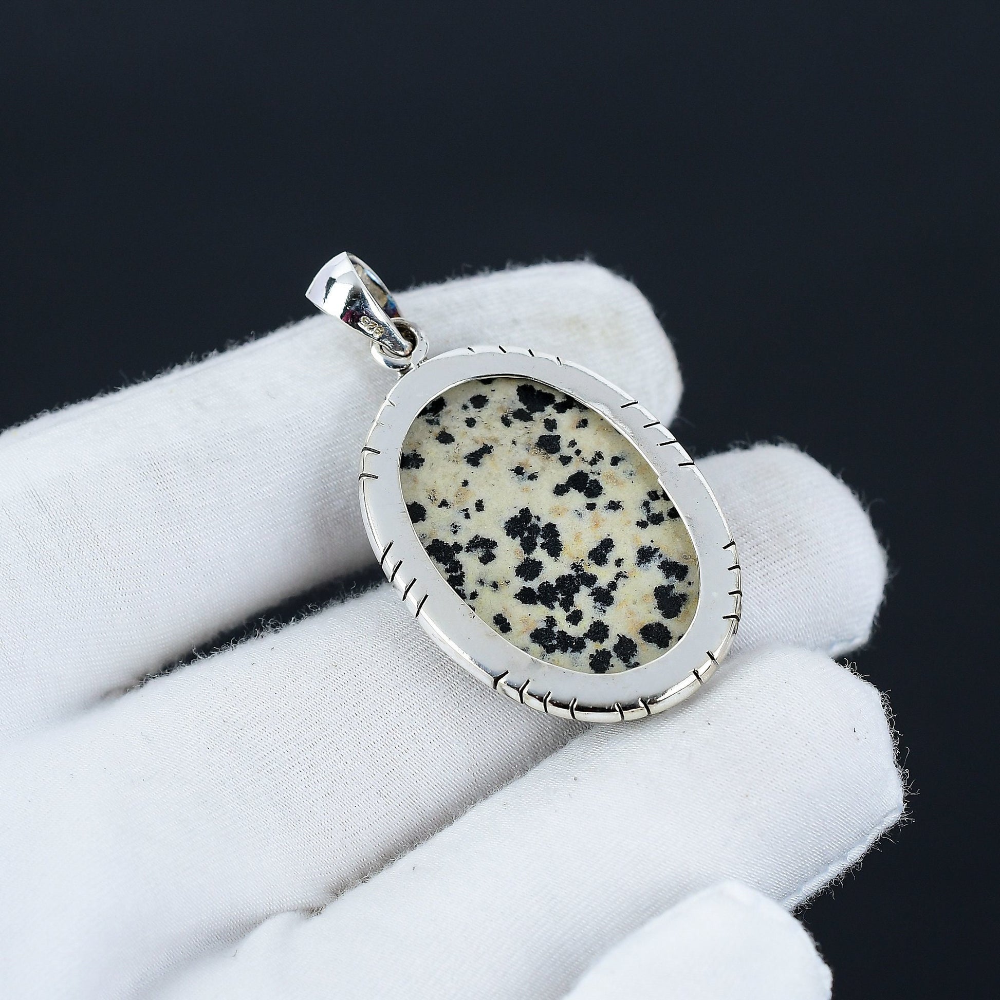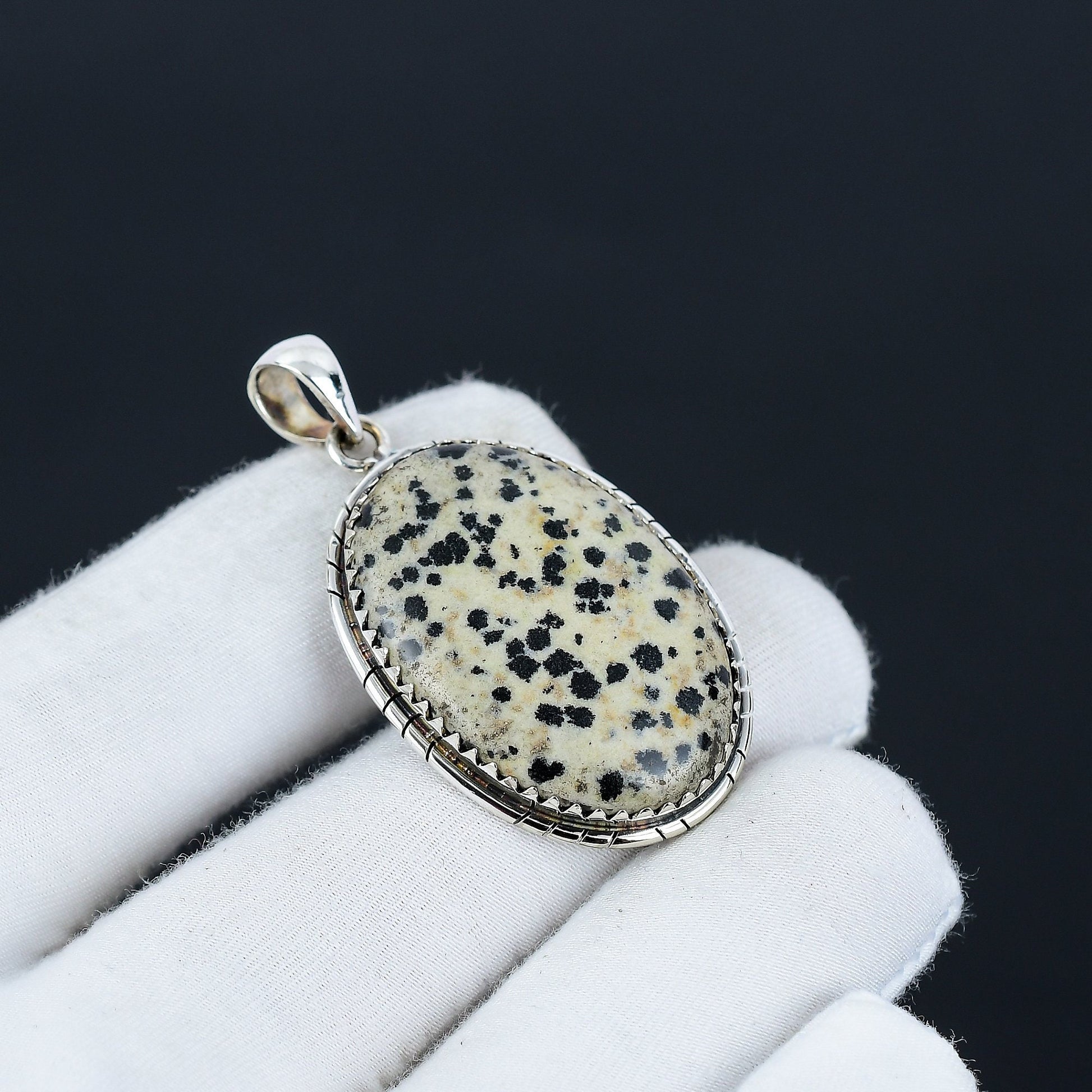 - Unique Stone: This pendant features a stunning Dalmatian Jasper stone, known for its distinctive black spots on a creamy backdrop, reminiscent of the charming Dalmatian breed.