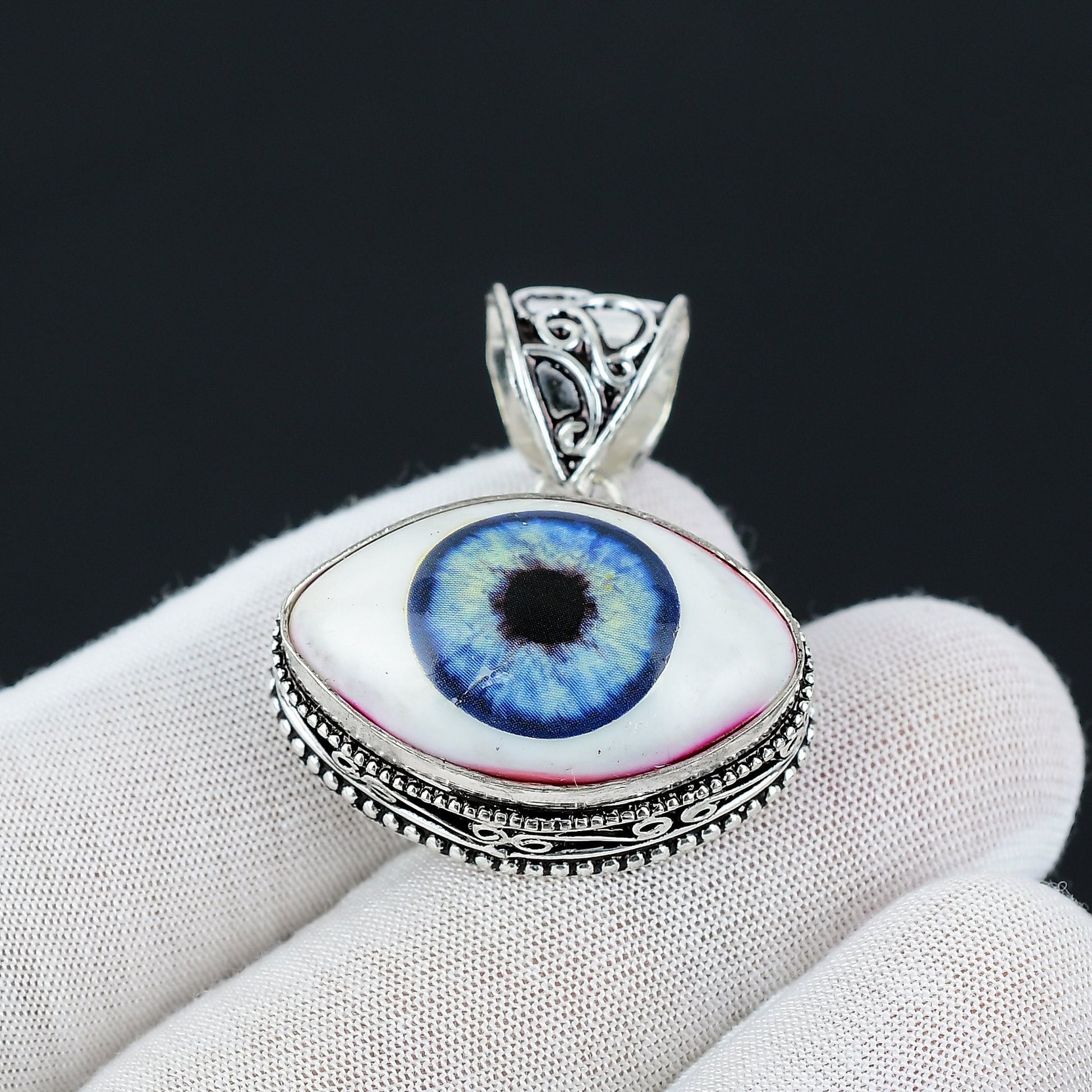 Featuring a detailed eye design with vibrant blue hues, this pendant is encased in an intricate silver-tone setting.