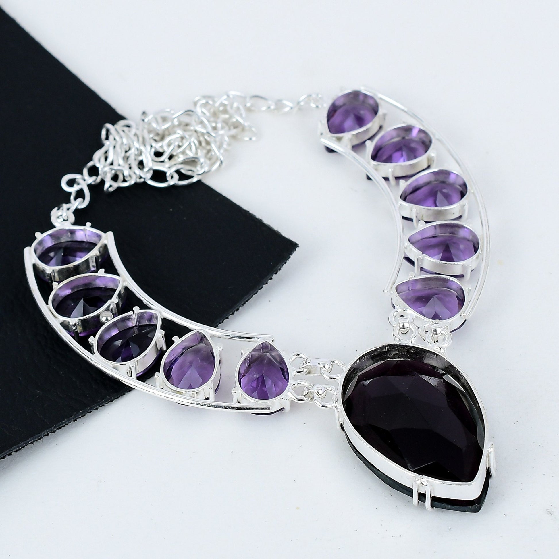 Elevate your elegance with our stunning statement necklace, featuring exquisite pear-shaped purple gemstones that gracefully accentuate your neckline.