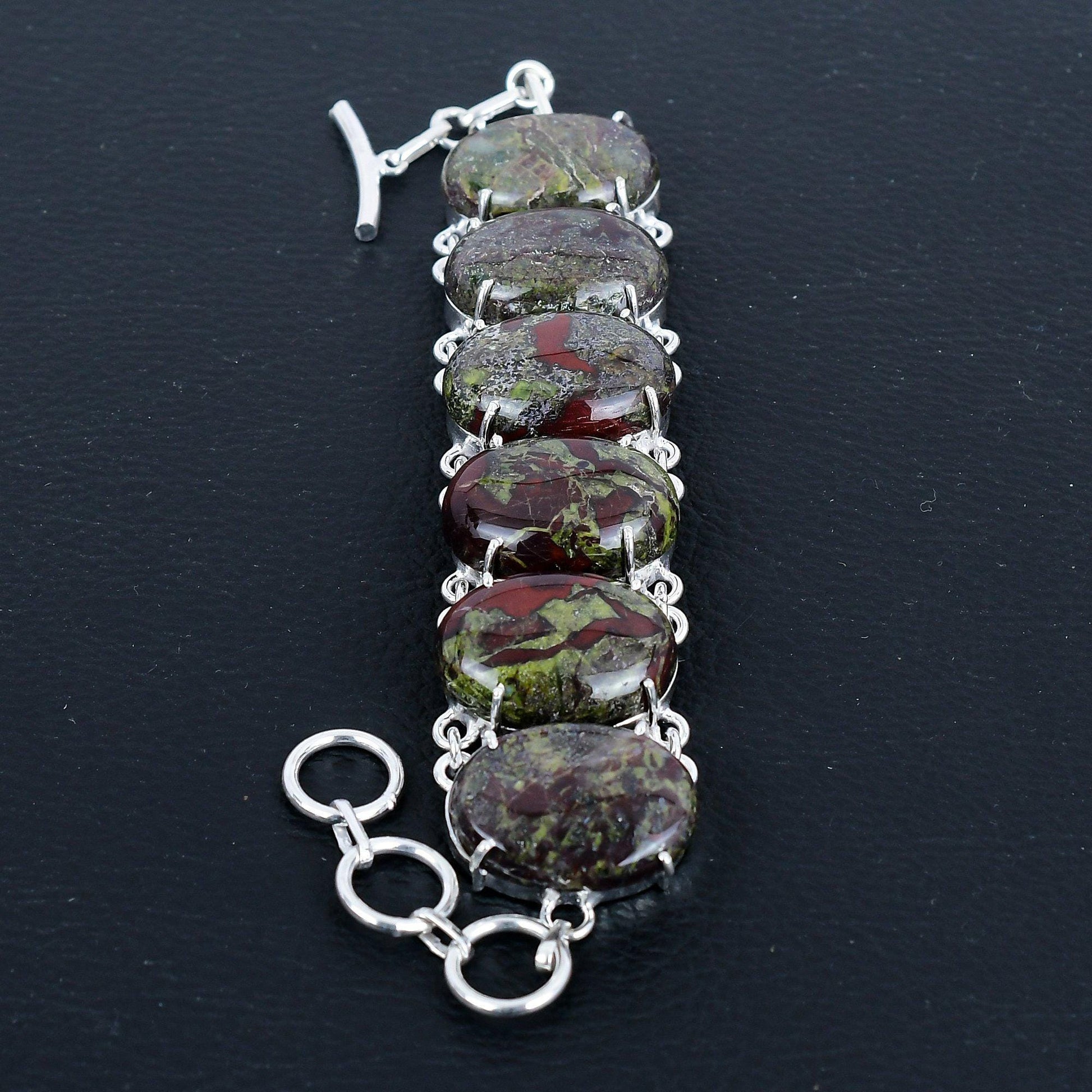 This exquisite piece features five polished Jasper stones, each with a unique blend of earthy hues and intricate patterns. Set in lustrous silver links, this bracelet seamlessly combines sophistication with timeless beauty.