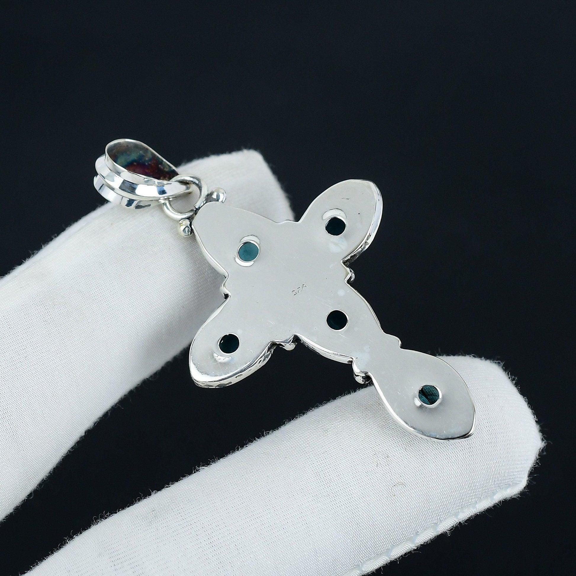Elevate your style with this exquisite cross-shaped pendant, showcasing five dazzling blue gemstones, each set in a lustrous silver frame.