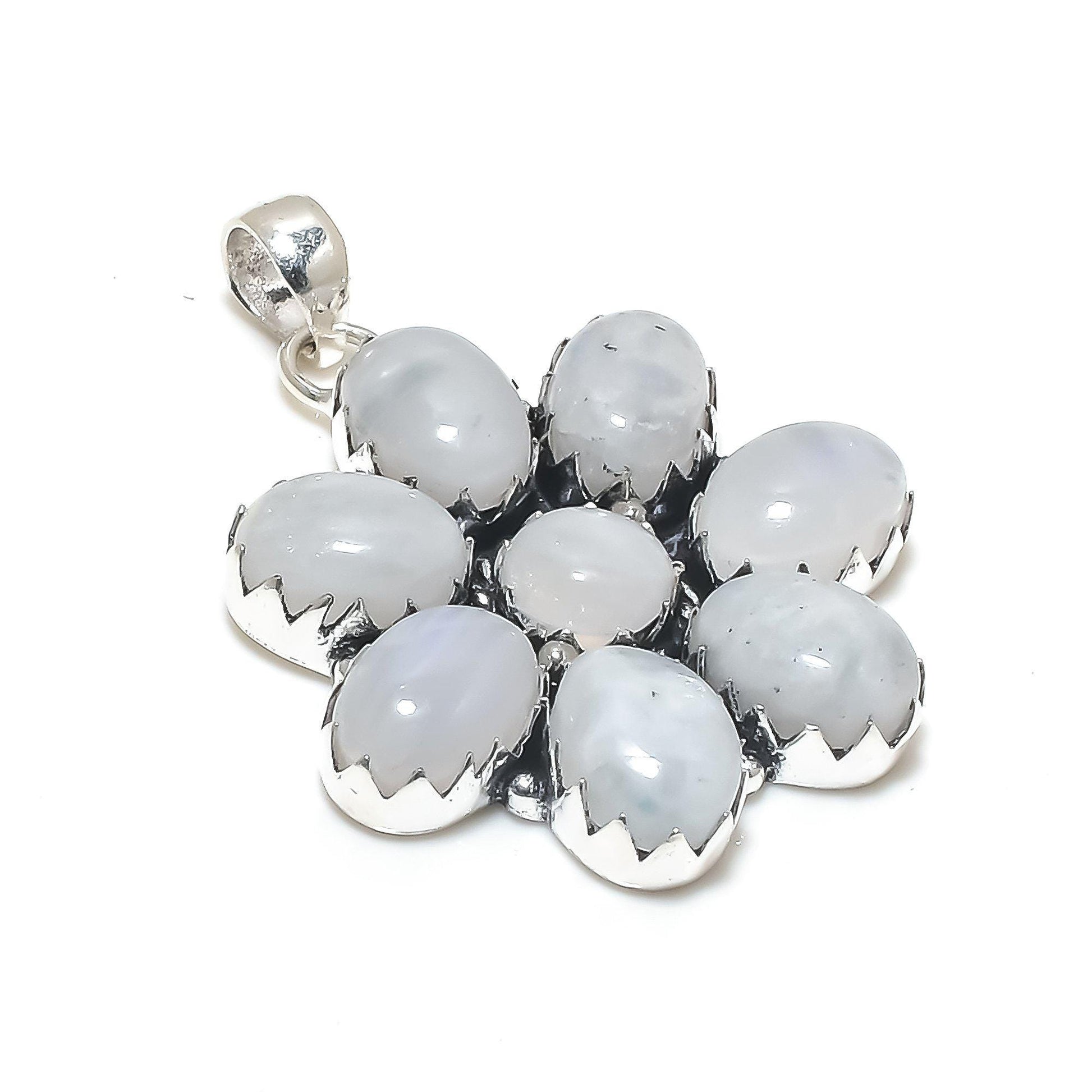 Featuring seven meticulously polished moonstone gems, this pendant captures the essence of natural beauty.
