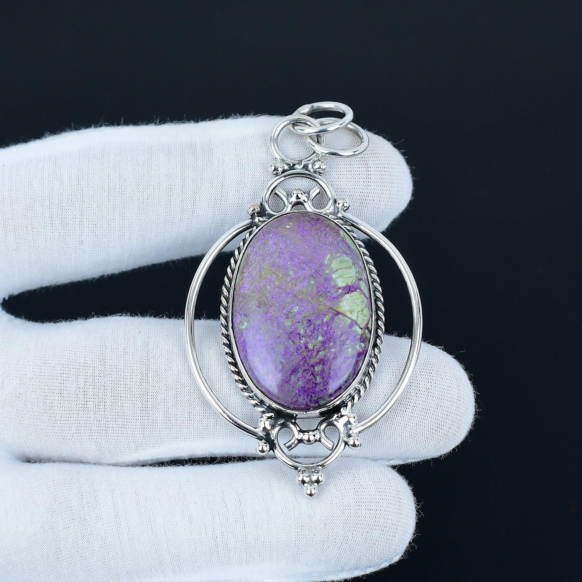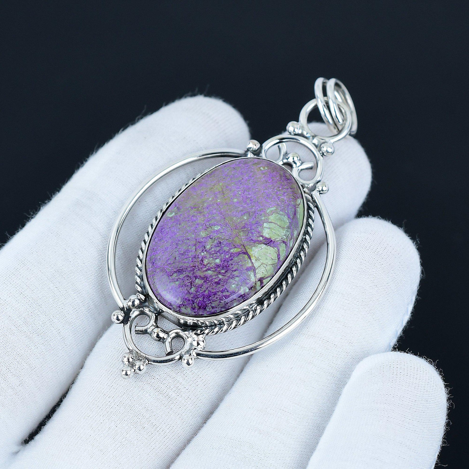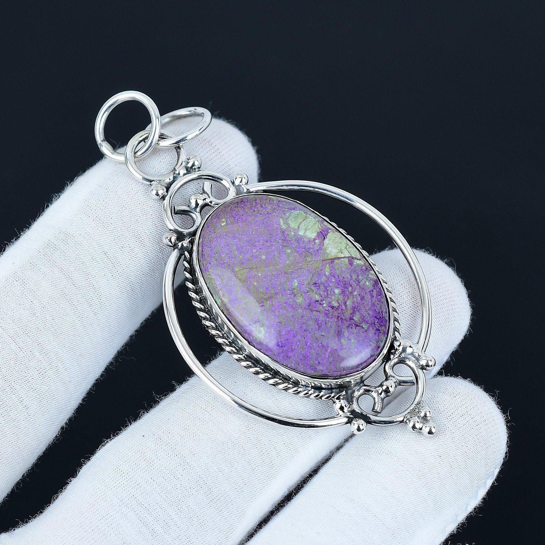 Enhance your elegance with our exquisite handcrafted pendant featuring a stunning purple gemstone centerpiece, set in a beautifully detailed silver frame.