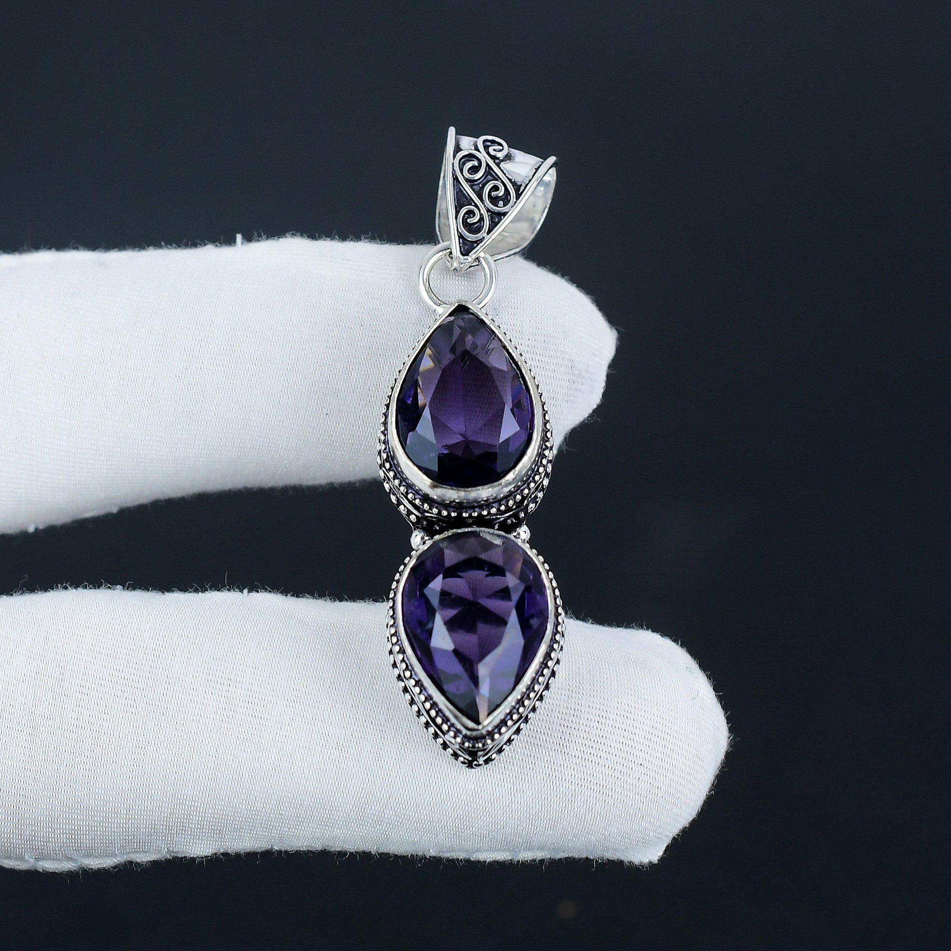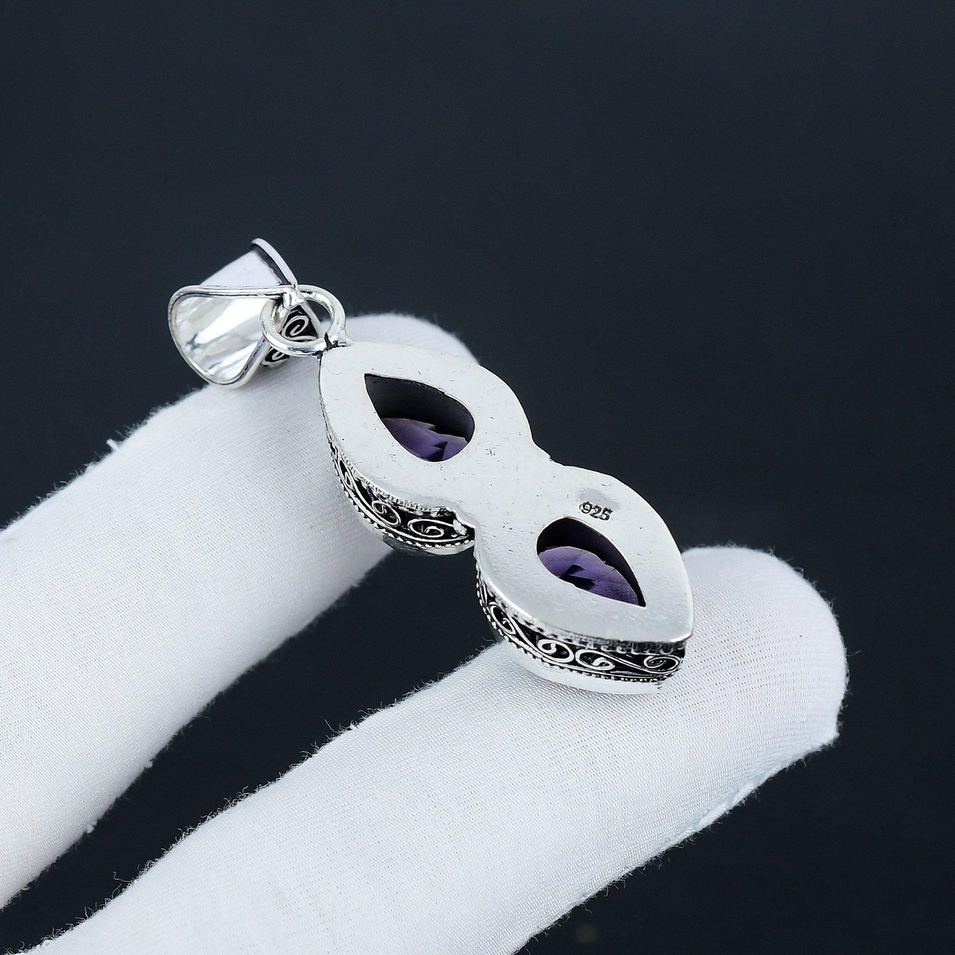 Embrace elegance with our stunning double-drop amethyst pendant. Crafted meticulously, each teardrop gem is encased in intricate silver detailing, capturing the beauty of timeless design.