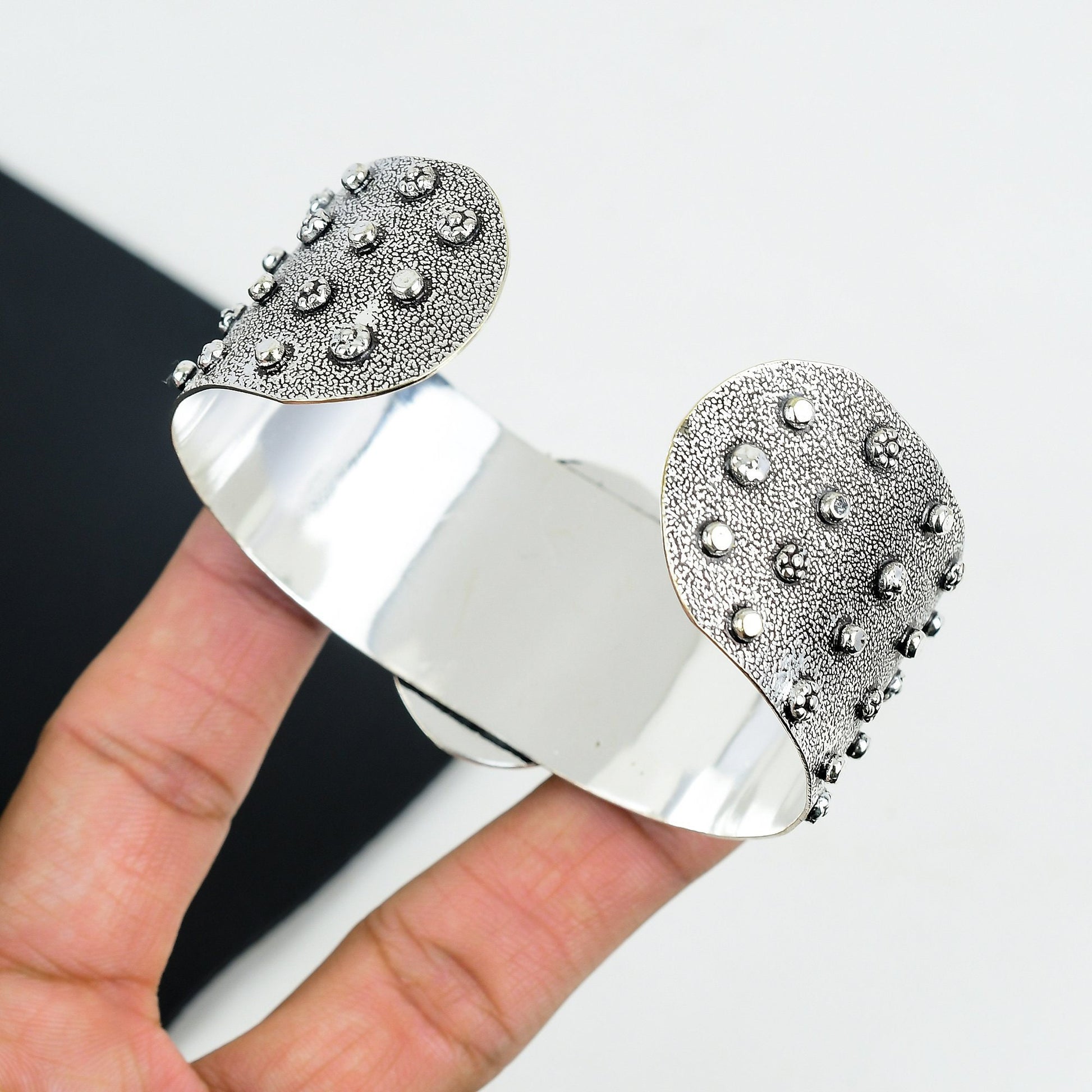 Expert craftsmanship is evident in the intricate detailing of the textured silver, adorned with delicate floral-inspired patterns.