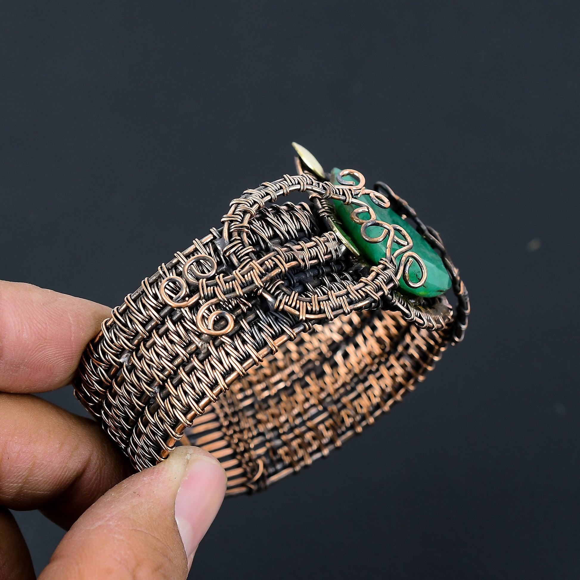 The bracelet features a stunning, polished green gemstone centerpiece, meticulously wrapped and secured by an intricate copper wire design. The craftsmanship is evident in the detailed weaving, creating a sophisticated and timeless look.
