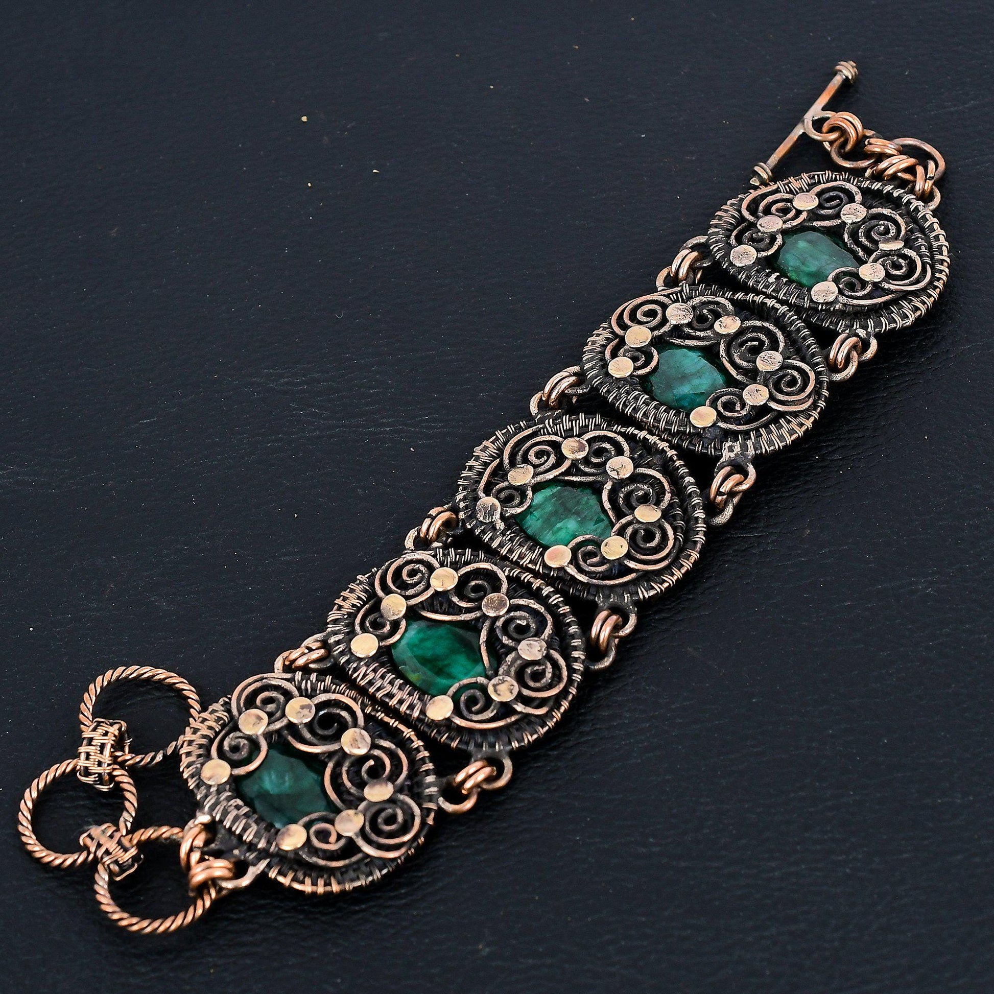 Embrace timeless elegance with this exquisite Antique Copper & Emerald Bracelet. Handcrafted with meticulous attention to detail, it features a captivating blend of rich copper and vibrant emerald-green stones.